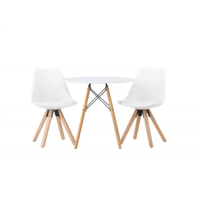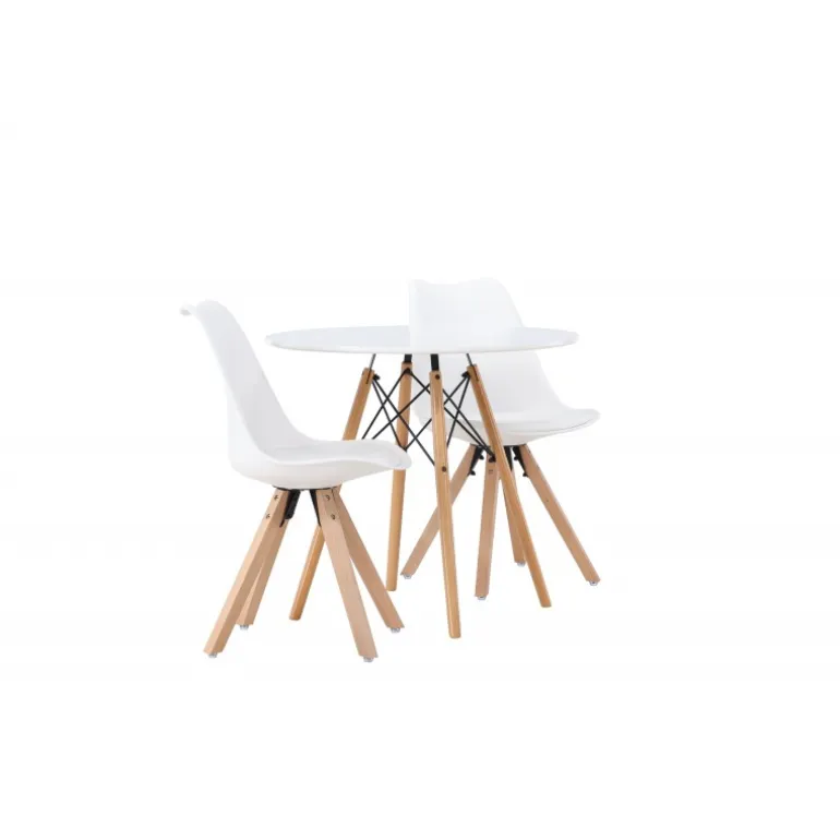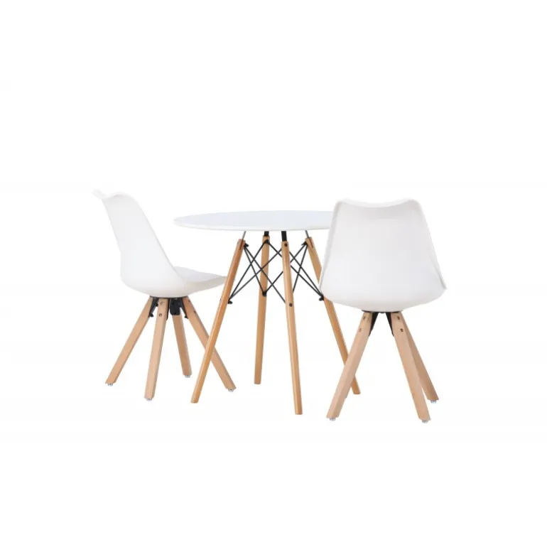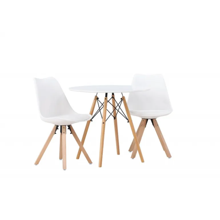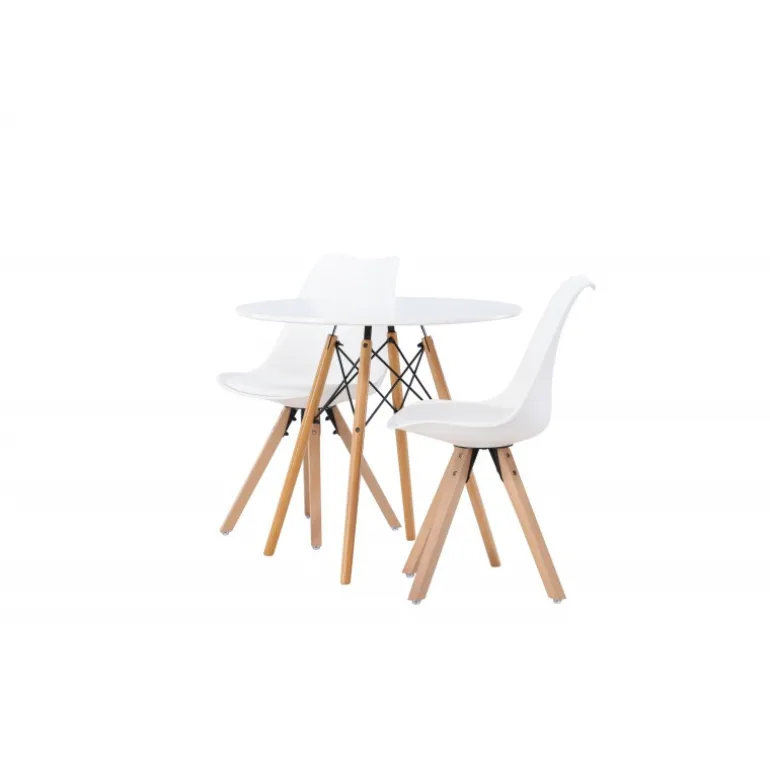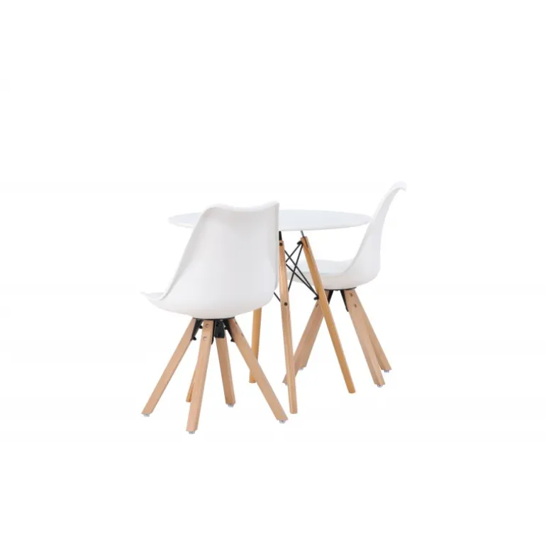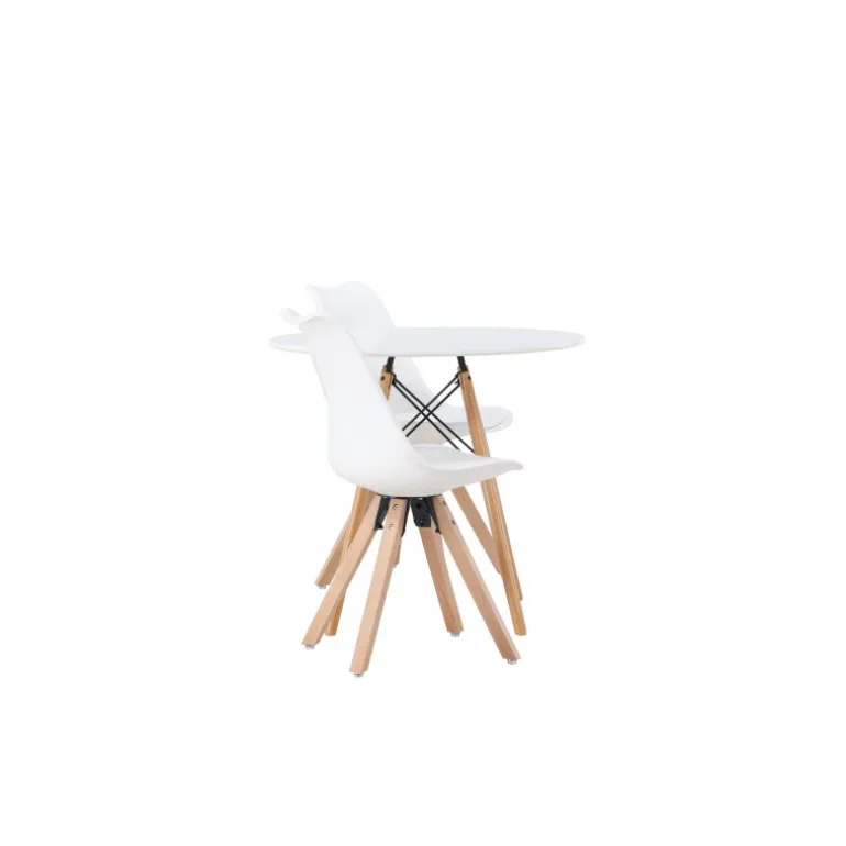 Oplev et fantastisk Spisebordssæt i kompakt størrelse! Det runde spisebord Danburi har et klassisk design med en rund bordplade i hvid MDF og let udadvendte ben i bøgetræ med dekorative detaljer i sort stål. Sammen med vores fantastiske, hvide spisebordsstole fra Zeno-serien. Stolen har et indbydende design med ryglæn og sæde i hvid plast, indbygget sædehynde med høj komfort og fire udadvendte ben i træ. Det bliver ikke bedre end dette! Bordets diameter: 60 cm.