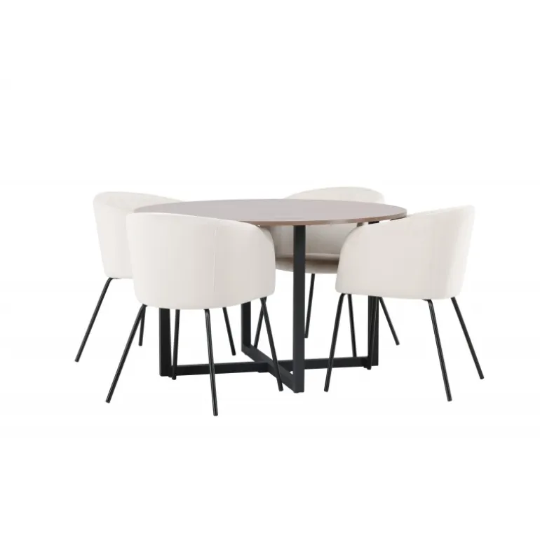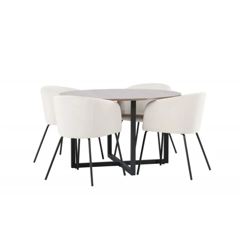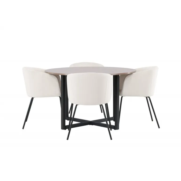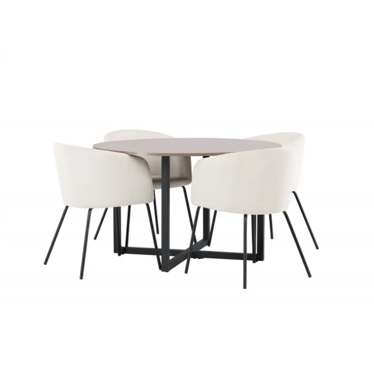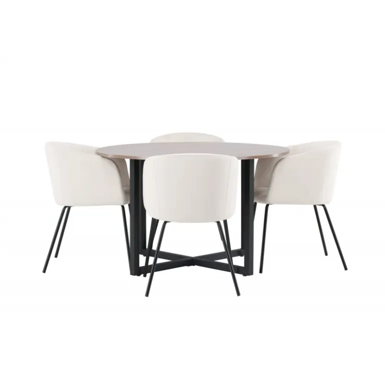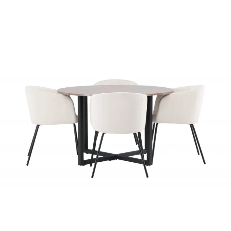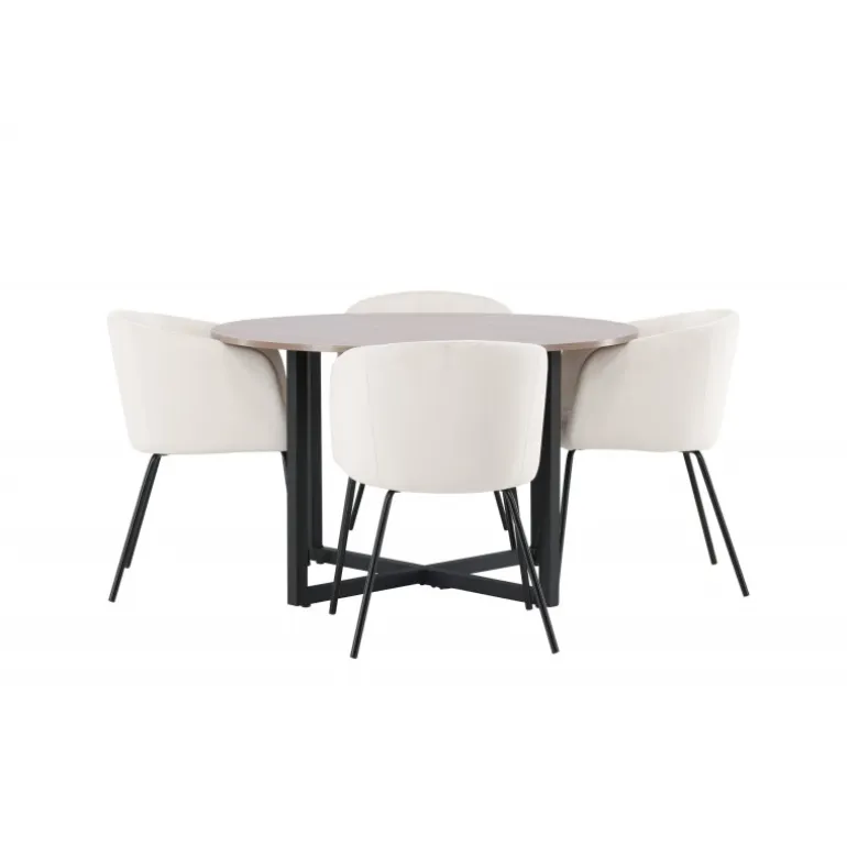 Oplev et fantastisk Spisebordssæt med bløde former! Vores runde spisebord Durango har en valnøddefarvet bordplade i MDF og lige bordben i sort stål, der samles i et kryds på gulvet. Her i en vidunderlig kombination med vores komfortable spisestole Berit. Stolen har et fuldt polstret design med en let rundet ryg og sæde i beige velourstof og smalle ben i sort jern. Det skal føles luksuriøst at sætte sig her! Bordets dimensioner: 120cm.