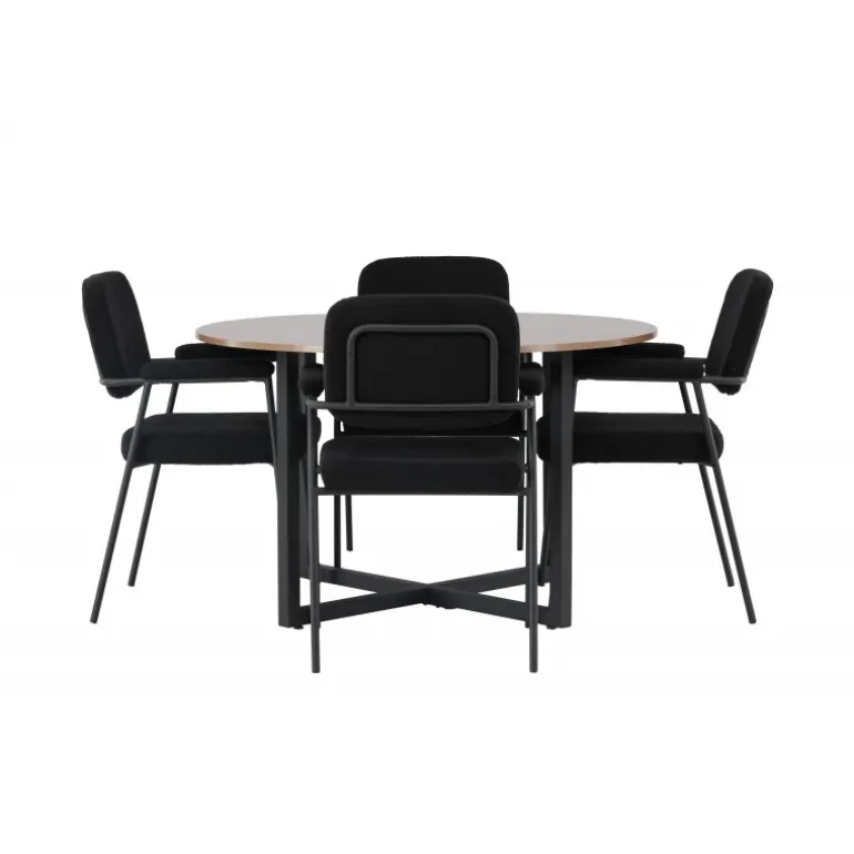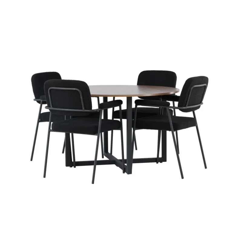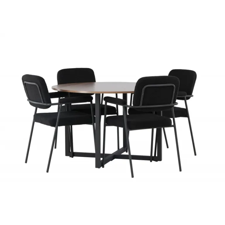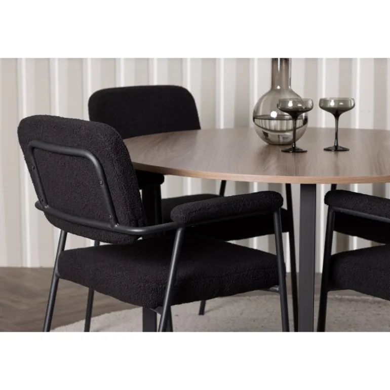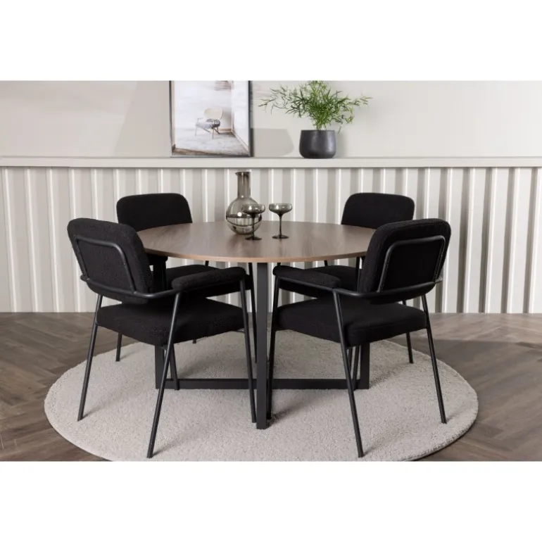 Velkommen hjem til moderne former, bløde materialer og en hyggelig atmosfære, der gennemtrænger hele stuen! Her mødes tidløst design og indbydende komfort for at skabe det perfekte rum til fantastiske måltider. Med vores populære spisestuebord Durango får du et charmerende midtpunkt at samles omkring. Den valnødfarvede MDF-bordplade tilføjer varme til indretningen, og de sorte stålbordben danner et elegant kryds på gulvet, der giver stabilitet til hele strukturen. Bordmål: 120 cm. Sammen med Durango-bordet følger vores sorte spisebordsstole fra Yesterday-serien, der forbedrer fornemmelsen af skandinavisk design i dit hjem. Disse dejlige stole tilbyder et fuldt polstret sæde i sort boucle-stof, hvilket giver et sofistikeret og moderne præg. De slanke stoleben med integrerede armlæn i sort metal komplementerer stolen perfekt og skaber en afbalanceret helhed. Nyd lange, hyggelige middagsstunder, mens du slapper af i det blødt polstrede sæde. Her får du ikke kun et stilfuldt Spisebordssæt, der hæver niveauet af stil i dit hjem, men også holdbare møbler, der står tidens prøve!