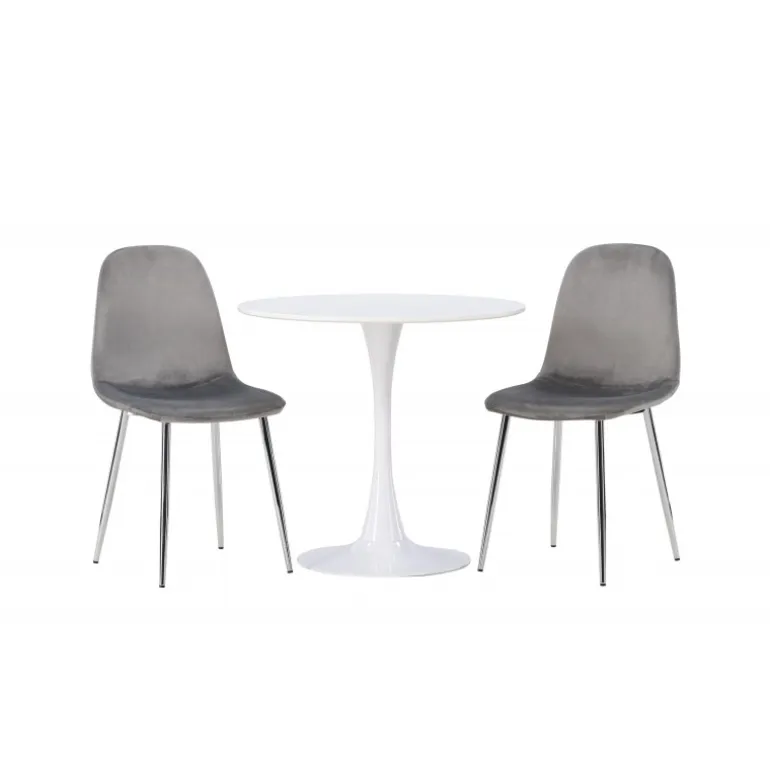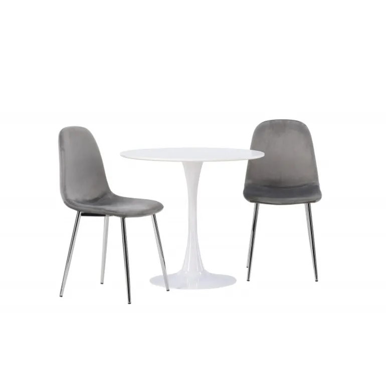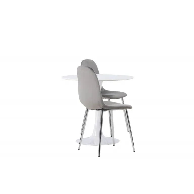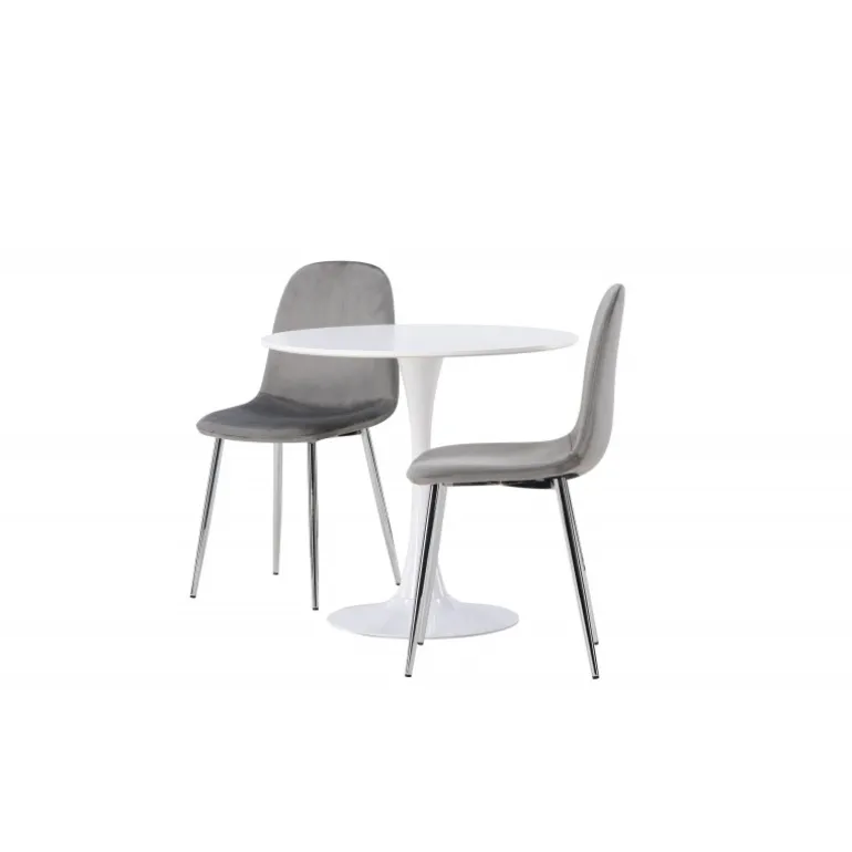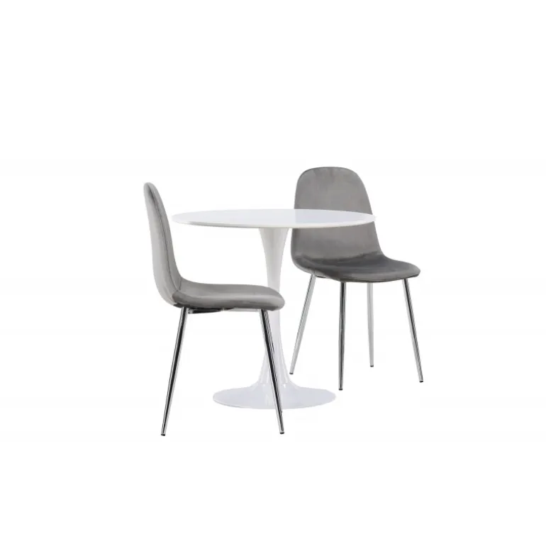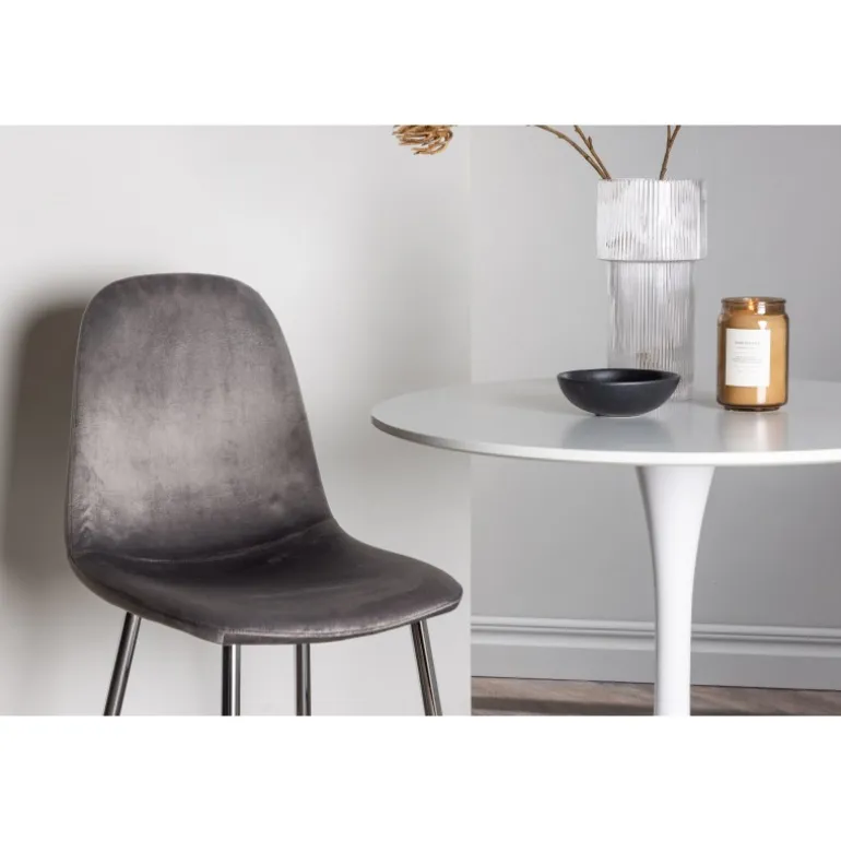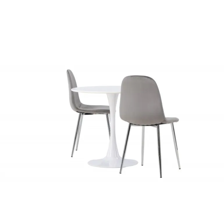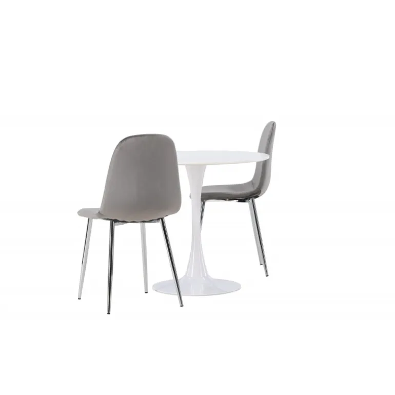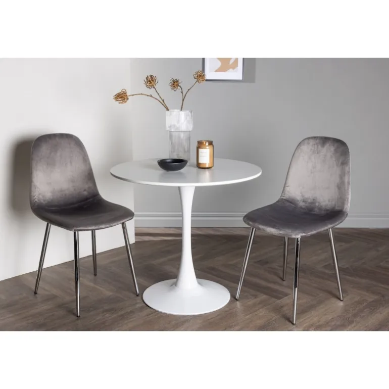 En stilfuld farvekombination! Det runde spisebord Hamden har en tynd bordplade i hvid MDF og en elegant trompetfod i hvidt stål. Her i en moderne kombination med grå spisestole fra Eva-serien. Stolen har et fuldt polstret design med ben i krommetal, en let afrundet ryg og sæde i slankt gråt velourstof med blød polstring for ekstra komfort. Sæt dig ned og sid behageligt! Borddiameter: 60 cm.