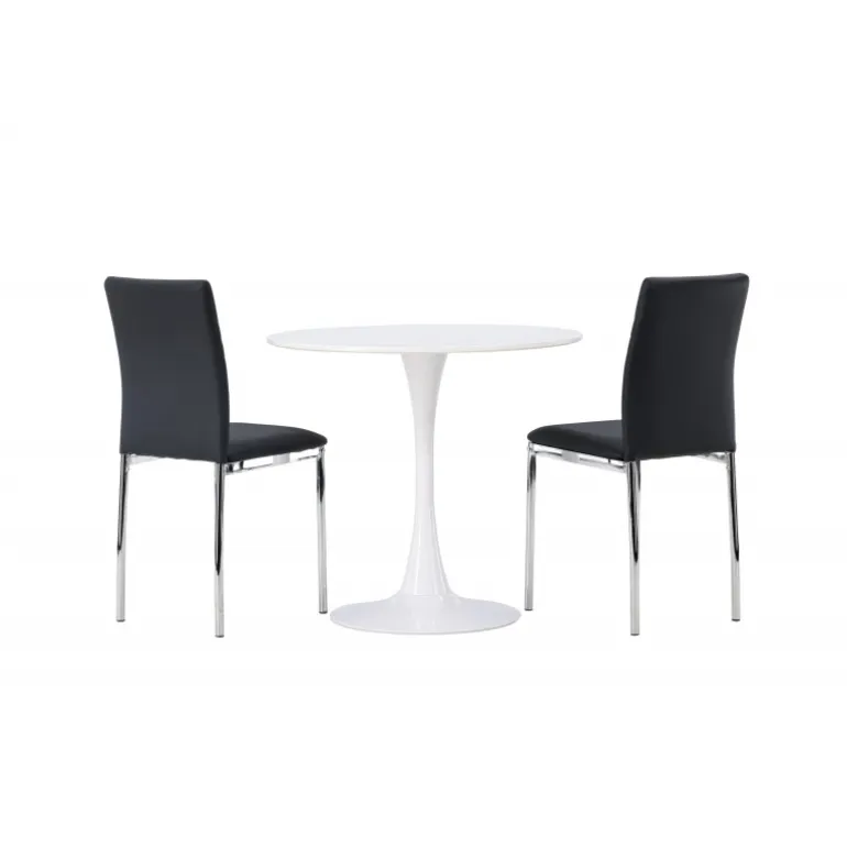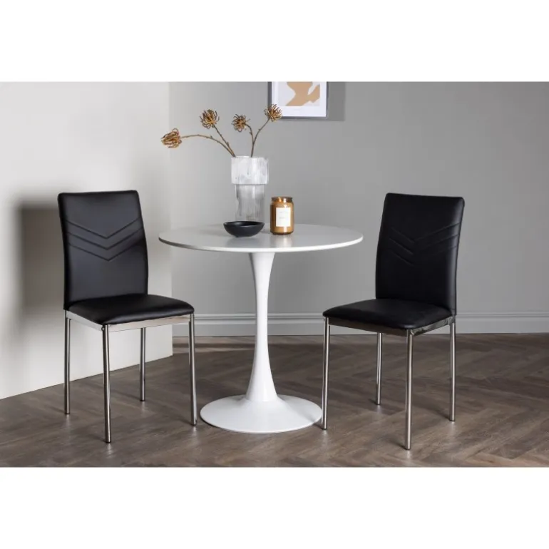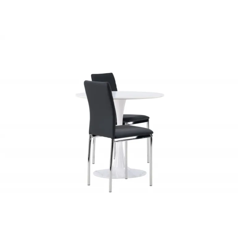Dette sæt passer perfekt i det lille køkken! Det runde spisebord Hamden har en tynd bordplade i hvid MDF og en stilfuld trompetfod i hvid stål. Her sammen med dekorative, sorte spisebordsstole fra Lily-serien. Stolen er fuldt polstret i sort kunstlæder, og ryglænet har dekorative syninger, der bliver til en stilfuld detalje. Stolebenene er i forkromet stål og giver et stilfuldt industrielt look, der fanger øjet. Skab et charmerende midtpunkt i dit hjem! Bordets diameter: 60 cm.