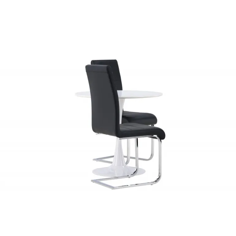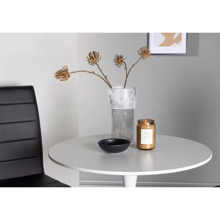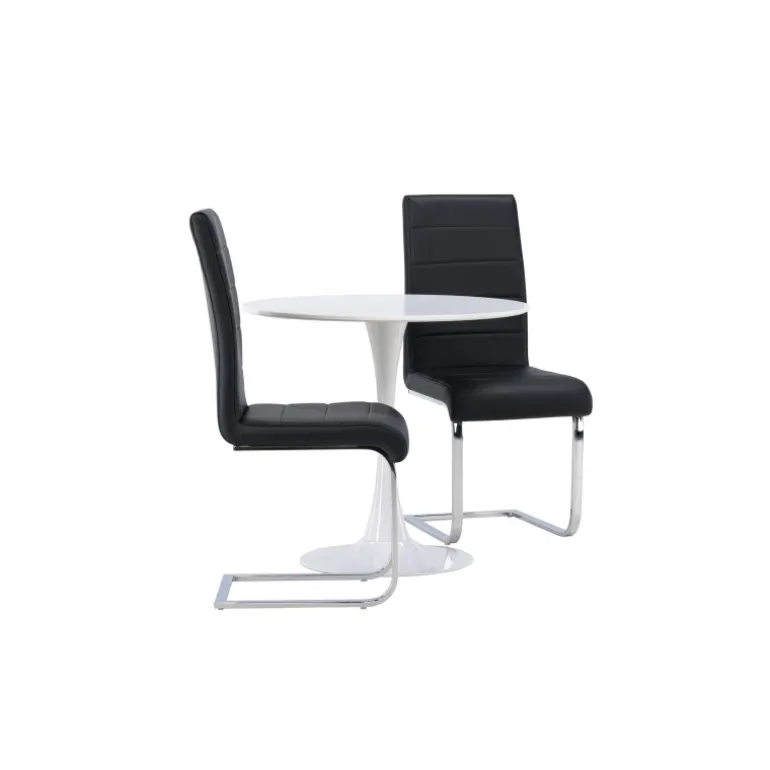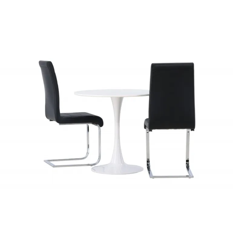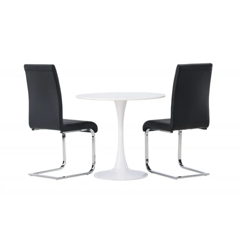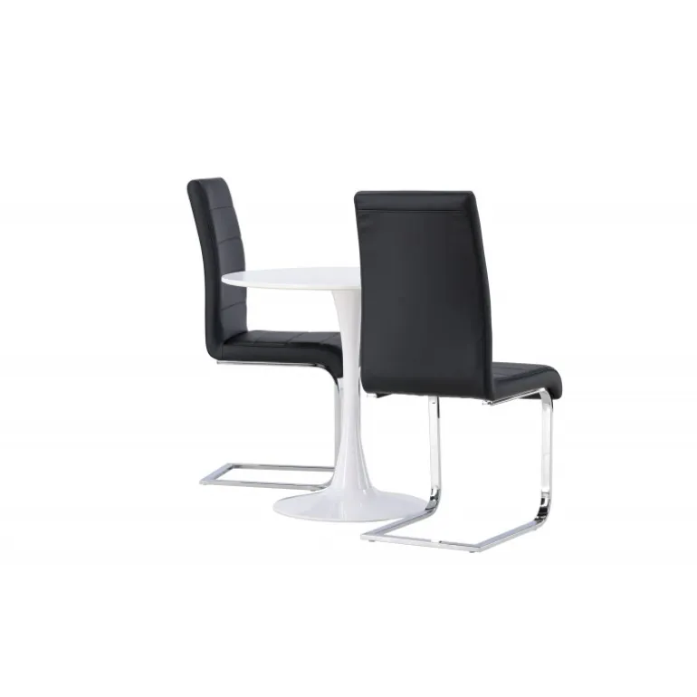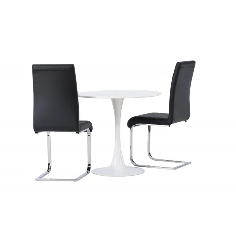 Oplev en skøn kombination af industriel design og høj komfort! Det runde spisebord Hamden har en tynd bordplade i hvid MDF og en stilfuld trompetfod i hvid stål. Sammen med de elegante, sorte spisestole fra Tempo-serien skaber det en perfekt gruppe til det mindre køkken. Stolen har en lige ryg i sort PU med dekorative syninger og ben i forkromet metal. Bordets diameter: 60 cm.