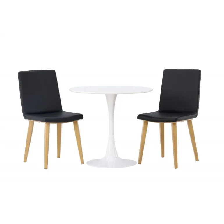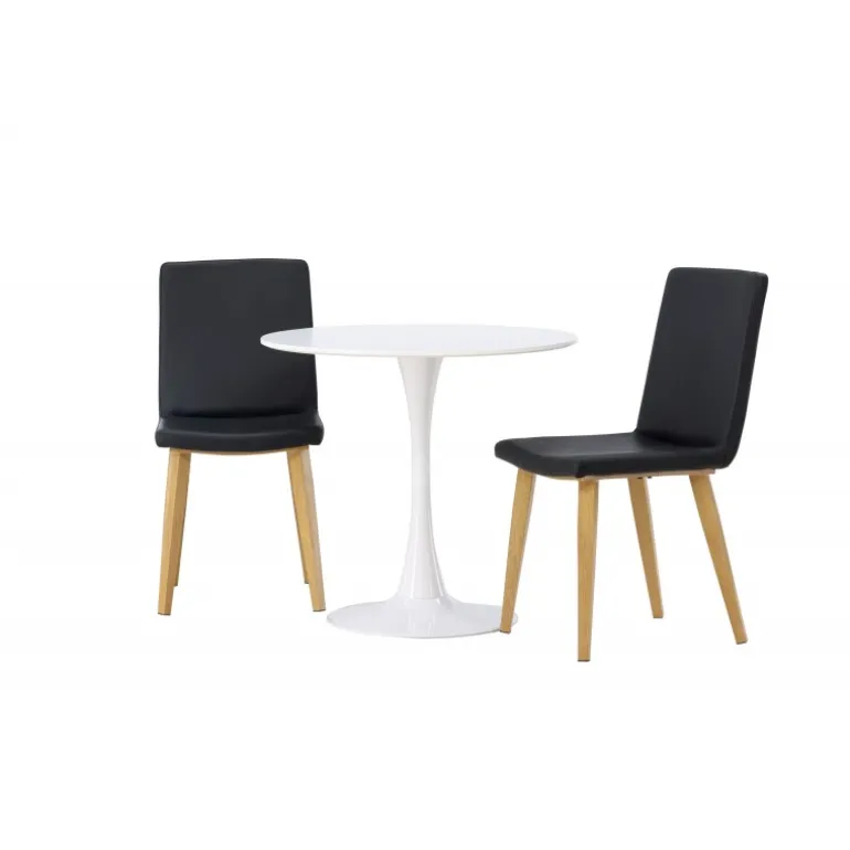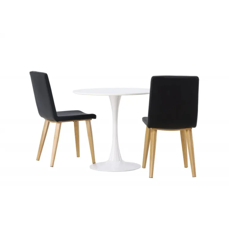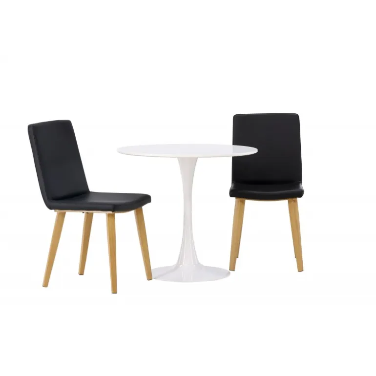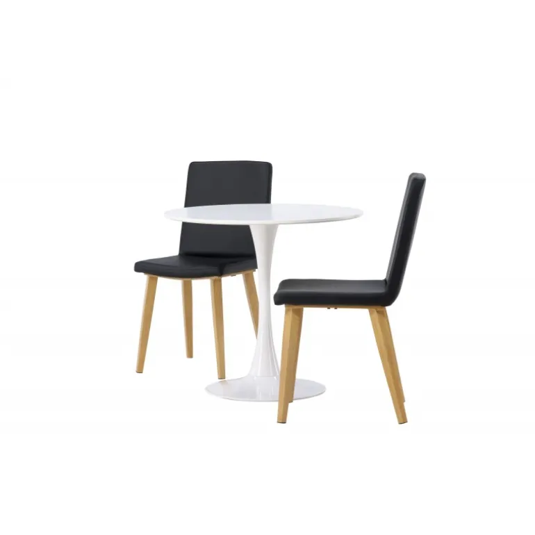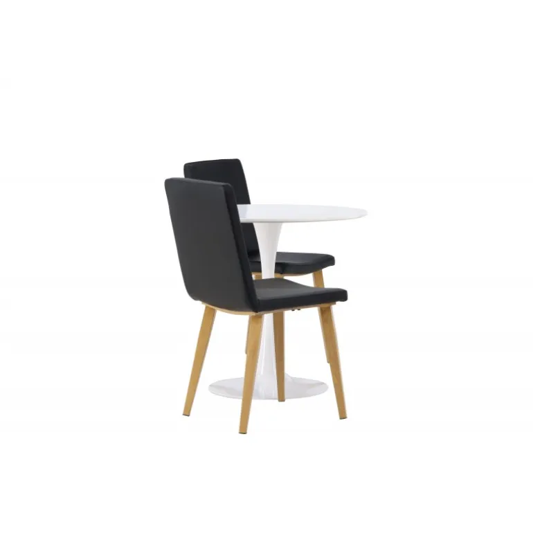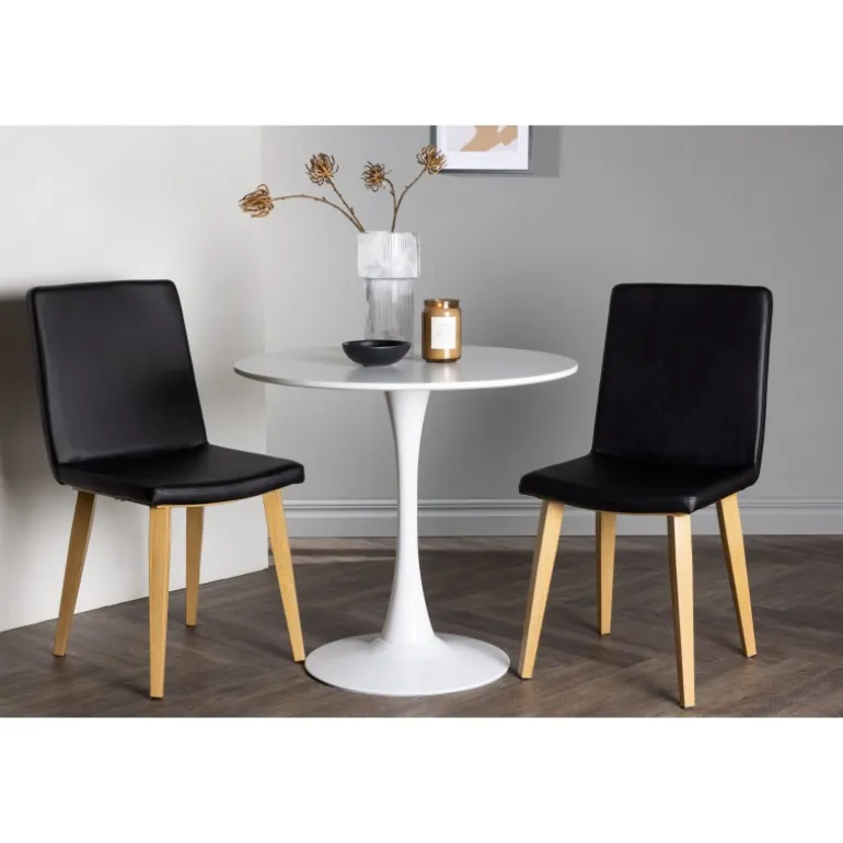 Indret komfortabelt og luksuriøst! Det runde spisebord Hamden har en tynd bordplade i hvid MDF og et stilfuldt trompetben i hvidt stål. Her sammen med klassiske spisestole fra Today-serien. Stolen har lige nordiske former og et glat, fuldt polstret sæde i sort kunstlæder. Stolebenene er let udadgående i naturtræ og giver et stabilt indtryk. Skab en personlig atmosfære! Bordets diameter: 60 cm.