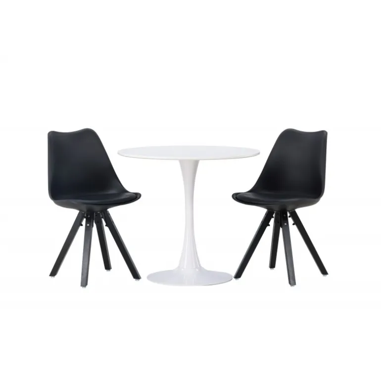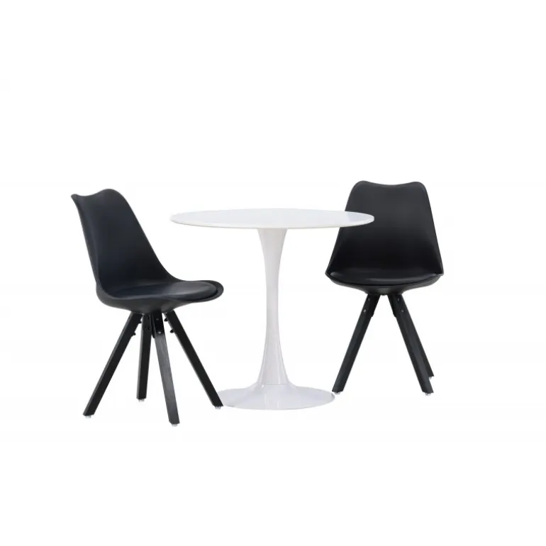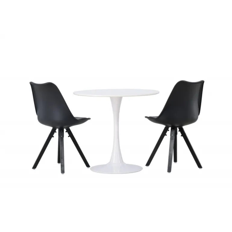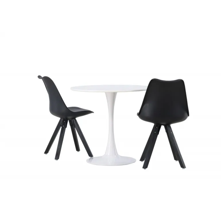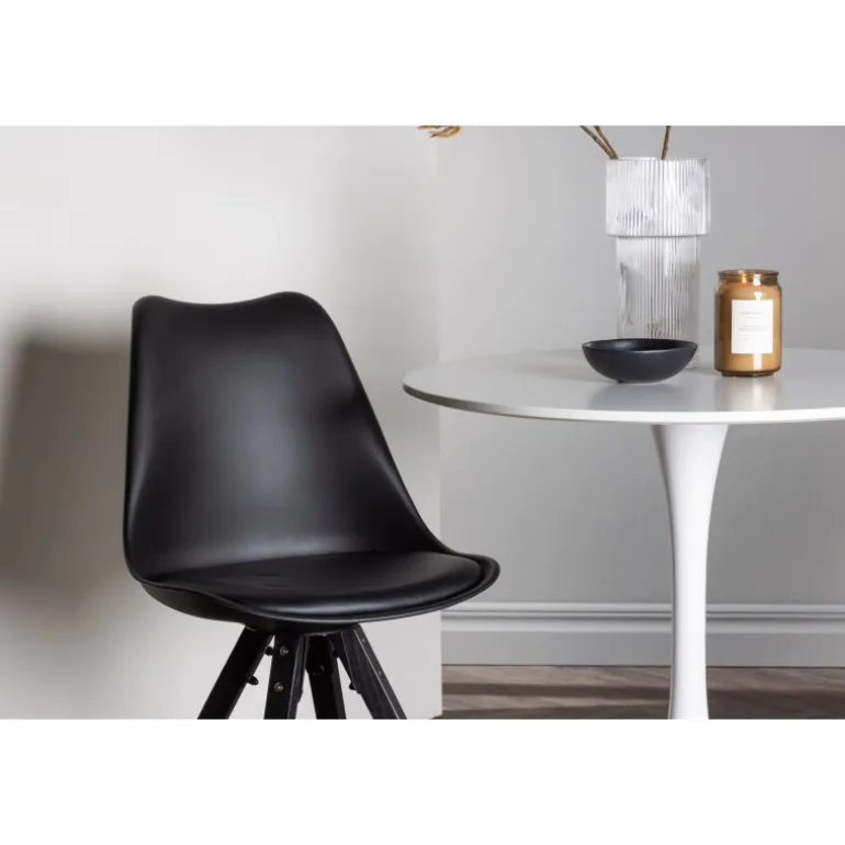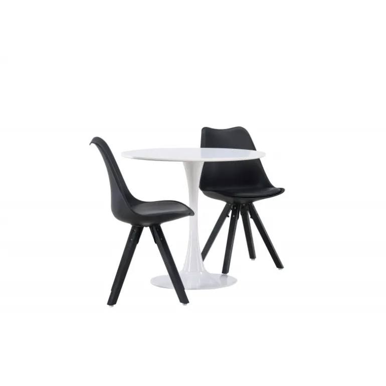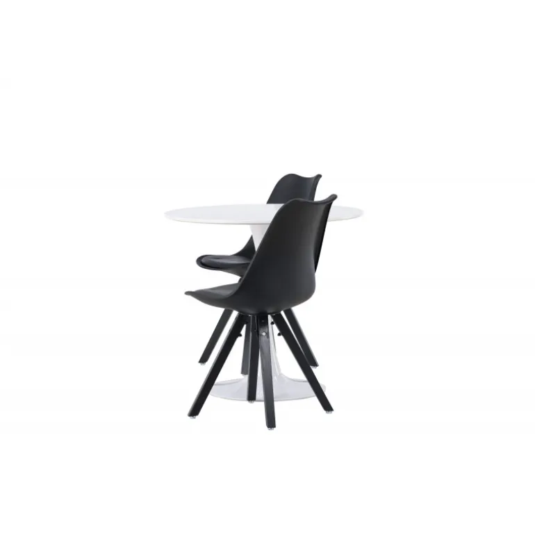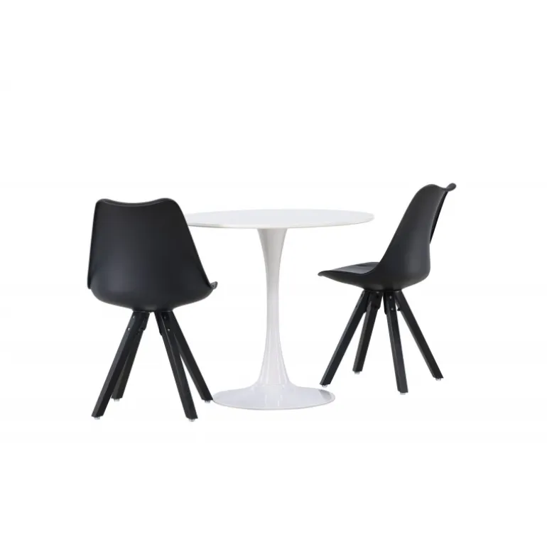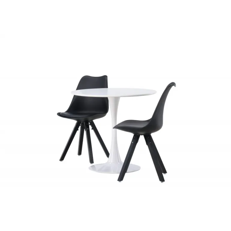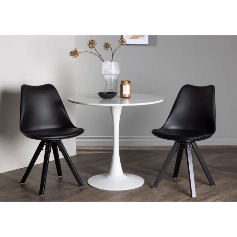 Kan det blive bedre end dette? Det runde spisebord Hamden har en tynd bordplade i hvid MDF og en stilfuld trumpetfod i hvid stål. Her i en elegant kombination med bæredygtige spisebordsstole fra Zeno-serien. Stolen har et indbydende design med ryglæn og sæde i sort plastik, indbygget sædepude med høj komfort og fire udadvendte ben i sort træ. Lige så stilfuldt som smart! Borddiameter: 60 cm.