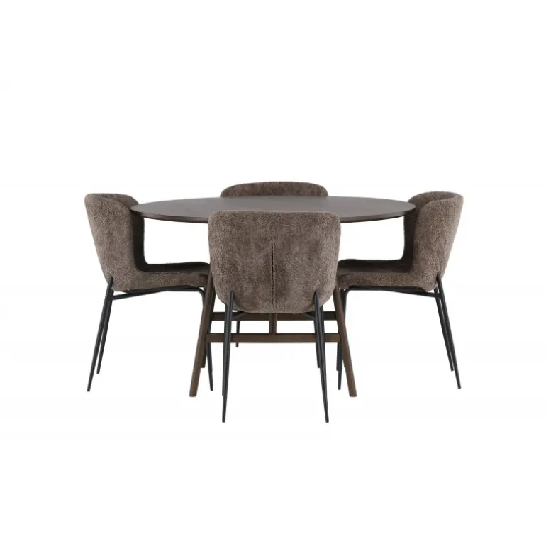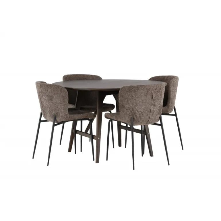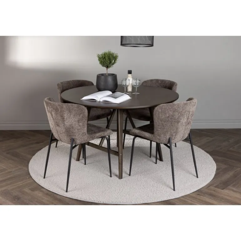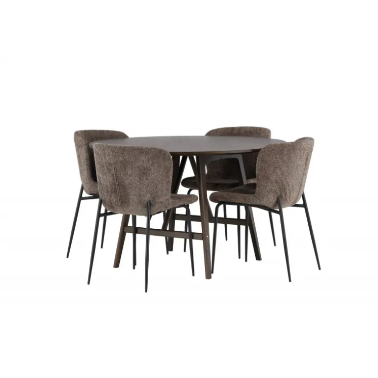 Oplev elegant luksus og tidløs skandinavisk design med vores Spisebordssæt Kaseindon med Modesto stole! Vores runde spisebord, Kaseindon, har et moderne design med en slank bordplade og nænsomt buede ben lavet af bæredygtigt MDF og gummitræ. Bordet udstråler jordnær elegance med sin varme valnøddebrune nuance, som også nemt matcher andet interiør. Bordets dimensioner er 100 cm. Sammen med stolene fra Modesto-serien skaber Kaseindon et perfekt match. Disse trendy stole er betrukket med gråt plysstof og har elegante, slanke sorte metalben. Den let afrundede rygstøtte og den polstrede sædepude giver fantastisk komfort, der forlænger de hyggelige stunder omkring spisebordet. Så snart du sætter dig, føler du straks en følelse af luksus og velvære. Dette Spisebordssæt skaber virkelig en atmosfære, hvor du kan nyde måltider med familie og venner, mens du føler dig afslappet og rolig. Det skal føles godt at komme hjem!