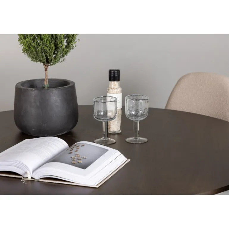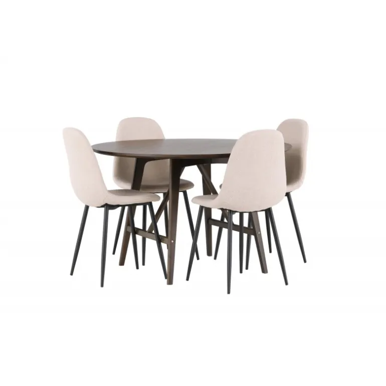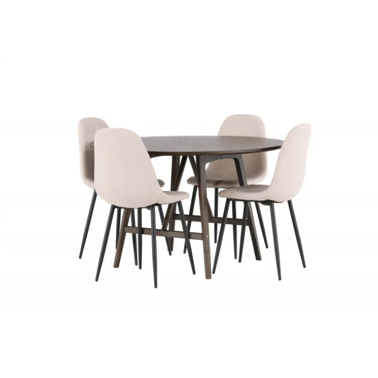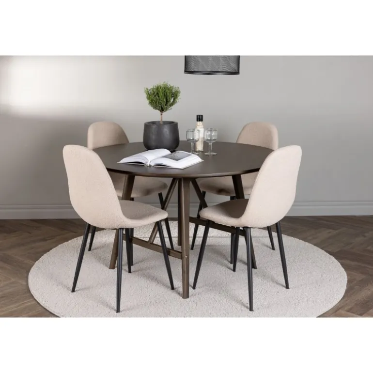 Velkommen til en ny niveau af stil og komfort med dette vidunderlige Spisebordssæt i jordnære farver! Vores imponerende runde spisebord Kaseindon er designet til at komplementere det stilfulde hjem og skabe en atmosfære af elegance og afslapning. Med en rund bordplade i valnøddefarve med en mat finish og let udadvendte ben med en stabiliserende ramme, lavet af høj kvalitet MDF og gummitræ, er dette bord både smukt og holdbart. Bordets dimensioner: 100 cm. Sammen med de beige spisestole fra Polar-serien skabes den perfekte farvekombination til en indbydende og charmerende stue. Stolene er polstret i luksuriøst boucle stof, der giver en øjeblikkelig følelse af moderne komfort. Med deres sorte stoleben forstærkes kontrasten og giver et stilfuldt touch til Spisebordssætn. Det skal føles godt at komme hjem og nyde vidunderlige måltider sammen med dine kære. Sæt dig ned, sid bekvemt og lad latter og samtale flyde frit – ingen ender på kanten her!