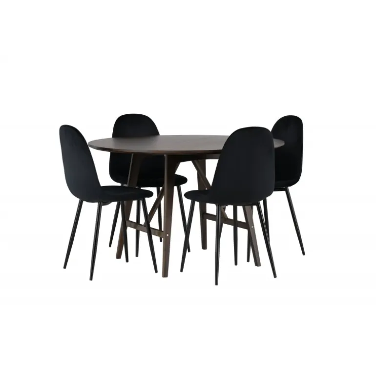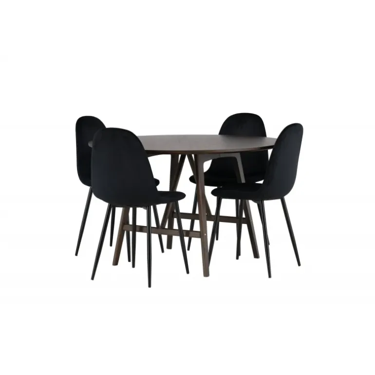 Skab en uimodståelig atmosfære i dit hjem med Kaseidon Spisebordssættet og de elegante Polar stole! Vores runde spisebord, Kaseidon, er perfekt for dem, der ønsker en stilfuld Spisebordssæt. Med sin runde MDF-bordplade og let udfladede ben i gummitræ, tilføjer dette moderne bord et trendbevidst touch til din stue. Men prikken over i’et er den mørkebrune farve, som giver bordet det lille ekstra, en varm tone, der hurtigt smelter ind i det moderne hjem. Bordmål: 100 cm. De elegante Polar stole komplementerer perfekt vores mørkebrune spisebord. Stolene har et fuldt polstret design med en afrundet ryg og sæde i sort velourstof, som giver en luksuriøs følelse. Den bløde polstring tilbyder en behagelig oplevelse, der får dig til at blive siddende længe efter middagen er slut. Med Kaseidon Spisebordssæt og Polar stole, får du ikke kun en praktisk og stilfuld Spisebordssæt, men også møbler der får dig og dine gæster til at føle sig hjemme. Velkommen hjem til en Spisebordssæt hvor stil og komfort mødes i perfekt harmoni!