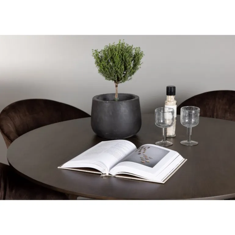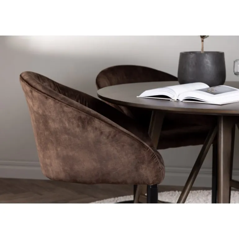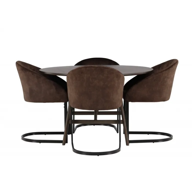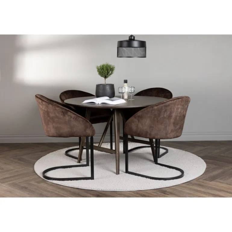 Skab en tidløs og luksuriøs atmosfære i dit moderne hjem med dette elegante Spisebordssæt! Vores runde spisebord, Kaseindon, har et iøjnefaldende design. Med en tynd bordplade og let buede ben har bordet et moderne og elegant udtryk. Bordet er helt lavet af MDF og gummitræ i en smagfuld valnøddebrun farve. Bords dimensioner: 100 cm. Her, kombineret med vores brune spisestole fra Evening-serien. Med sit nostalgiske udtryk og rene design bliver Evening-stolen en luksuriøs pynt ved dit spisebord. Den fuldt polstrede sæde og den buede ryglæn i brunt stof giver et komfortabelt og elegant udtryk til det samlede look, mens den minimalistiske base i mat brun stål tilføjer en stilfuld kontrast. Med dette Spisebordssæt kan du ikke kun nyde måltider i en elegant atmosfære, men også skabe et charmerende fokuspunkt i hjertet af dit hjem, hvor ingen risikerer at blive overset!