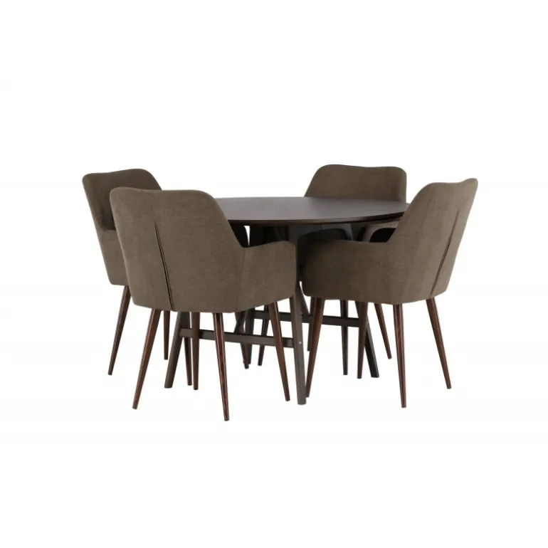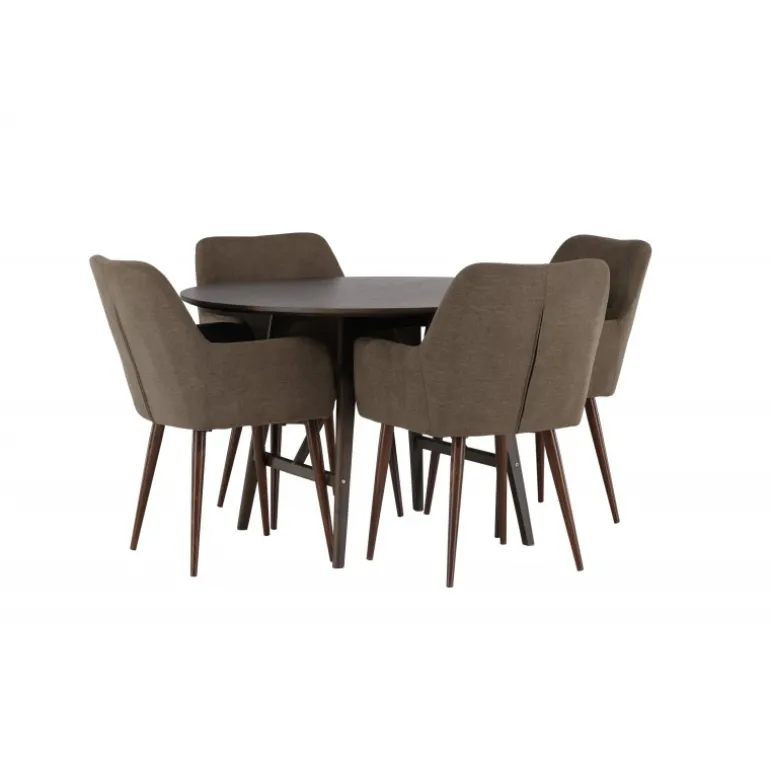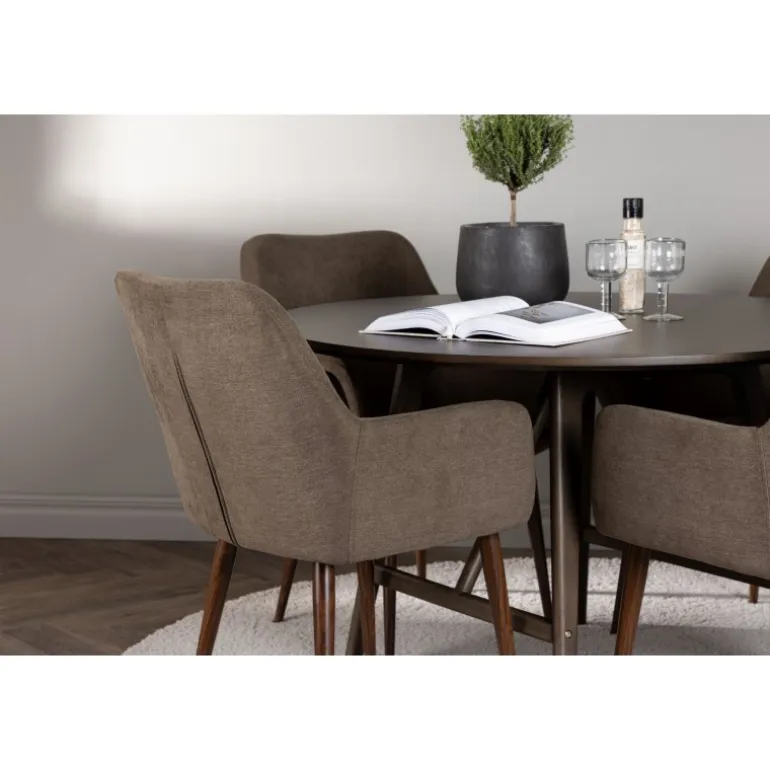 Sid behageligt og nyd hyggelige måltider omkring et Spisebordssæt, der udstråler charme og komfort! Vores mørkebrune spisebord, Kaseindon, fanger straks opmærksomheden med sin runde form og moderne valnøddefarve. Den matte overflade på bordpladen, lavet af MDF, tilføjer en sofistikeret touch til din stue. Med let udadsvajede ben og en stabiliserende ramme i gummitræ tilbyder bordet både stil og holdbarhed. Bordets dimensioner: 100 cm. I kombination med vores brune spisebordsstole fra Tomorrow-serien skabes en perfekt harmoni i hjertet af dit hjem. Med deres fuldt polstrede sæder i brunt polyesterstof og integrerede armlæn tilbyder disse stole enestående komfort. De let udadsvajede stoleben i den moderne valnøddebrune farve bidrager til at skabe et sammenhængende look i din stue eller køkken. Her får du ikke kun en elegant indretning, men også muligheden for at skabe en hyggelig atmosfære til lange og behagelige måltider. Lad latter og samtaler flyde omkring et Spisebordssæt, hvor ingen risikerer at ende på kanten!