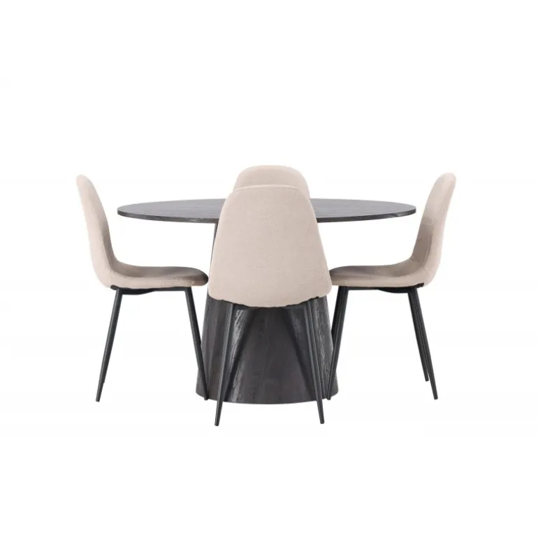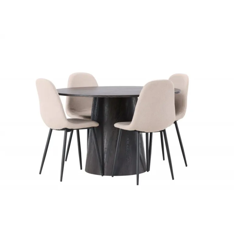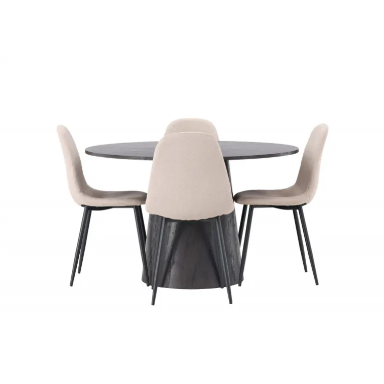 Jordnære toner og bløde former! Vores vidunderlige, runde spisebord Lanzo er designet i brun MDF med en tynd bordplade og en snoet cylindrisk ramme, der er centreret under midten af bordet. Her i en moderne kombination med beige spisebordsstole fra Polar-serien. Stolen har et fuldt polstret design, ben i sort pulverlakeret metal og en rundet ryg og sæde i beige boucle stof med blød polstring. Det bliver ikke bedre end dette! Borddiameter: 120cm.