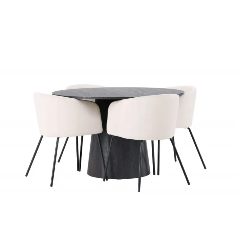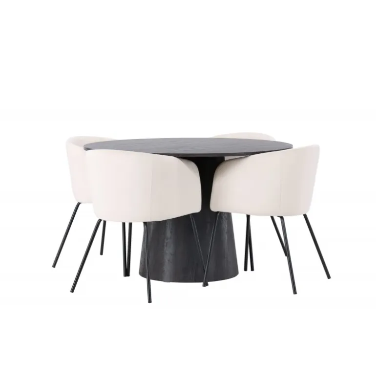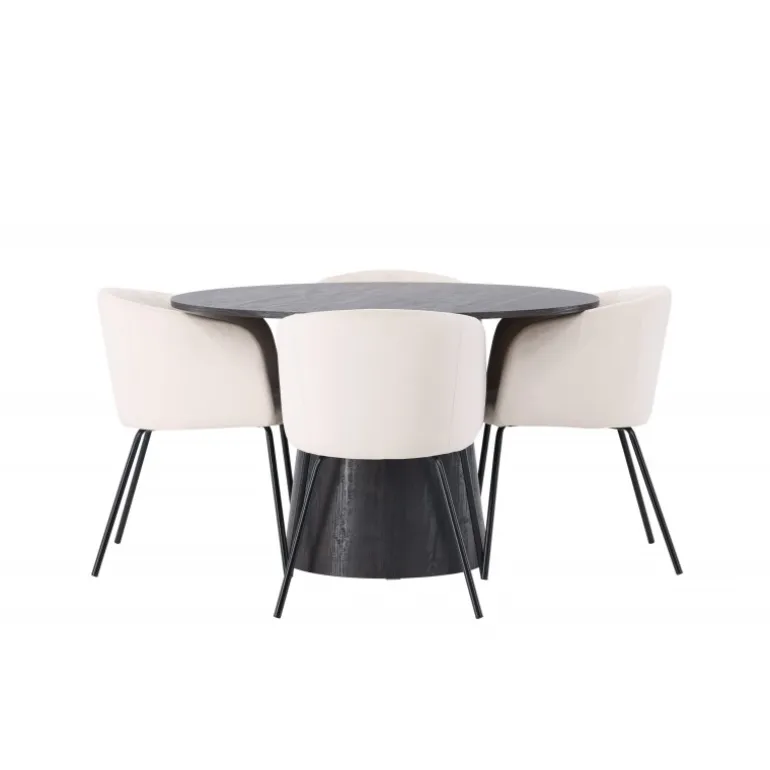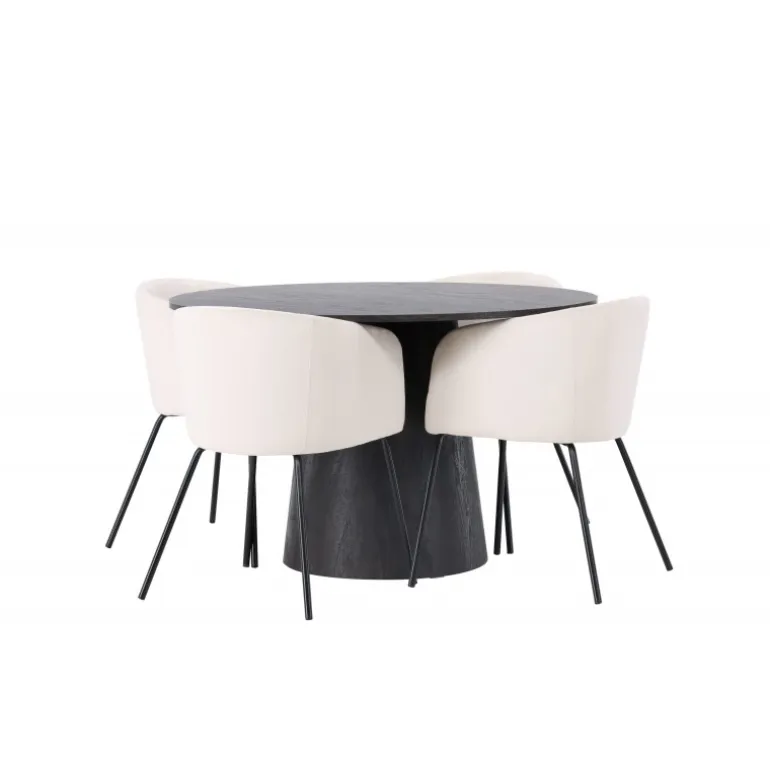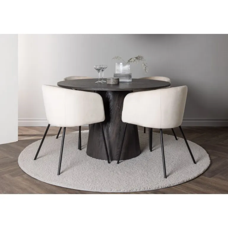 Et majestætisk og charmerende Spisebordssæt! Vores vidunderlige, runde spisebord Lanzo har et overordnet design i brun MDF med en tynd top og en snoet cylindrisk ramme, der er centreret under bordet. Her i elegant kombination med vores komfortable spisebordsstole Berit. Stolen har et fuldt polstret design med en let afrundet ryg og sæde i beige velourstof og smalle ben i sort jern. Dette Spisebordssæt udstråler luksus og komfort! Bordets diameter: 120 cm.