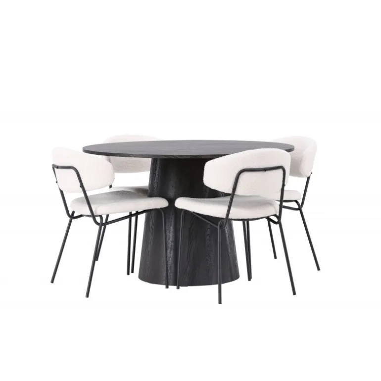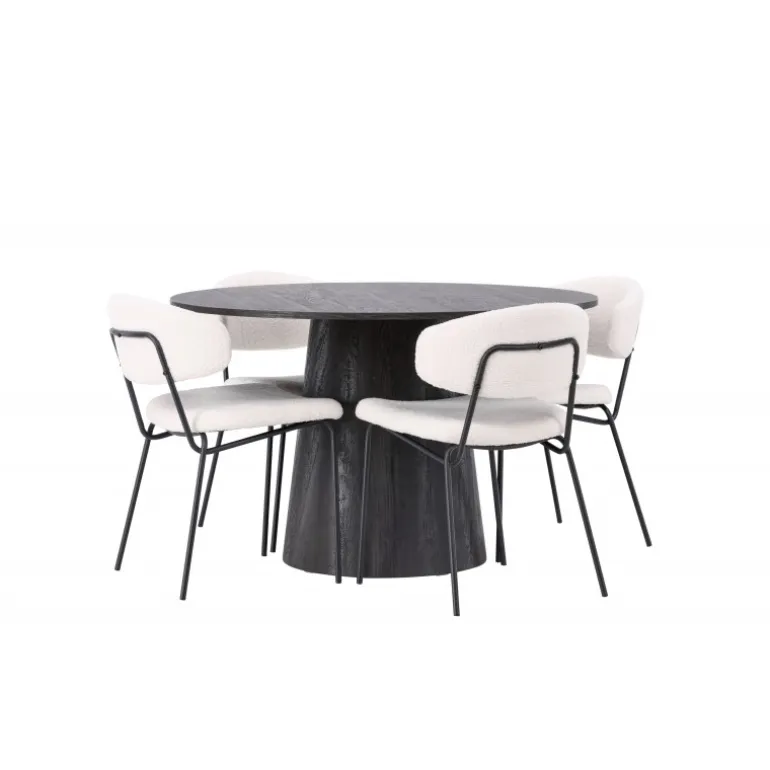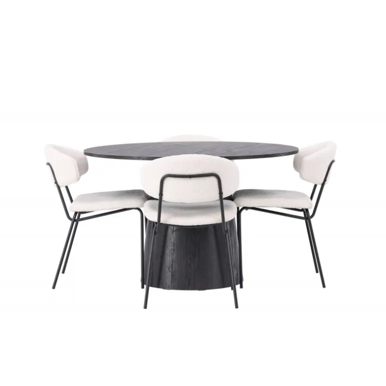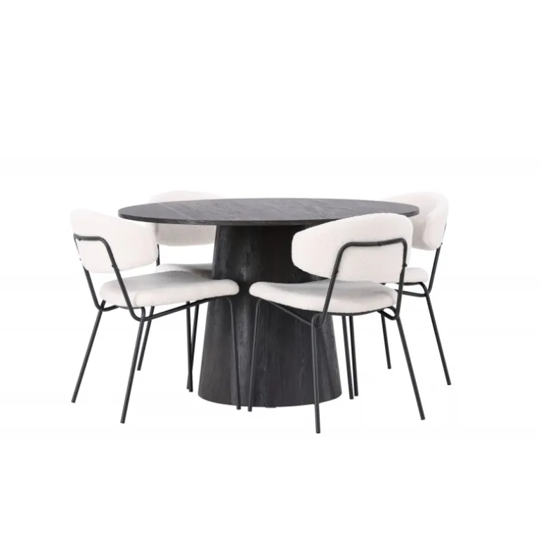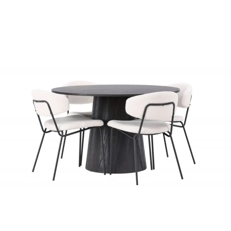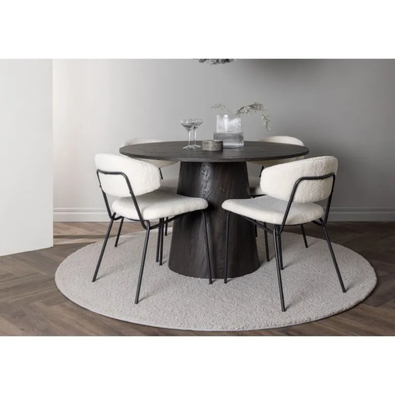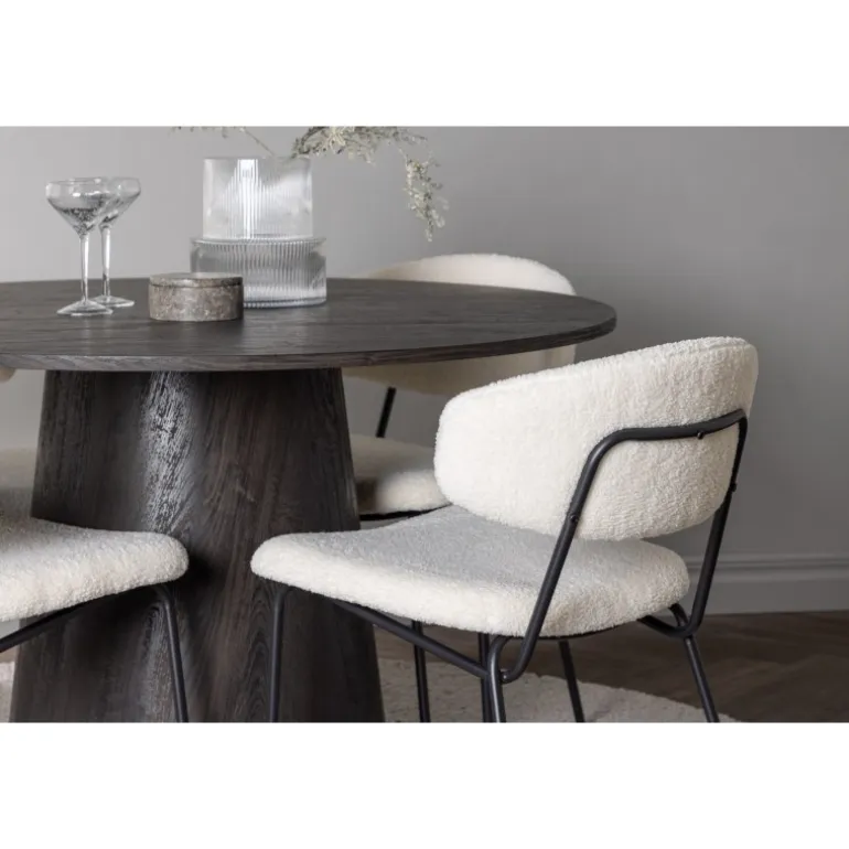 Dekorer dit hjem hyggeligt og indbydende! Vores vidunderlige, runde spisebord Lanzo har et overordnet design i brun MDF med en tynd top og en snoet cylindrisk ramme, der er centreret under bordet. Her i stilfuld kombination med vores hvide spisebordsstole fra Chico-serien. Stolen er i hvid bouclé stof med polstret sæde og ryglæn for ekstra komfort. Benene er smalle i sort stål, hvilket giver stolen en luftig følelse. Inviter til et charmerende midtpunkt! Borddiameter: 120 cm.