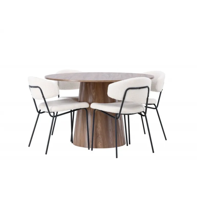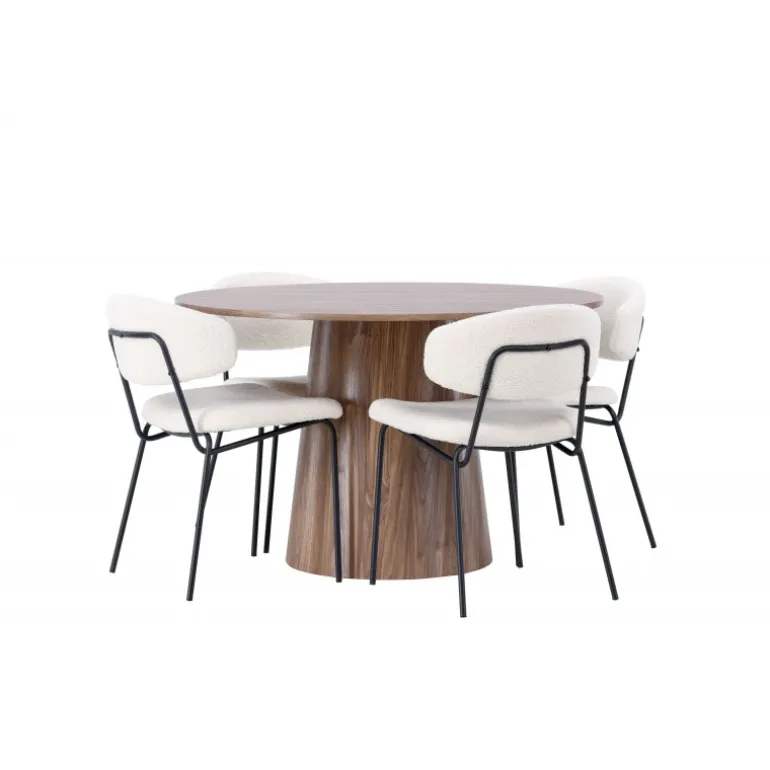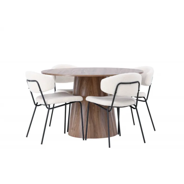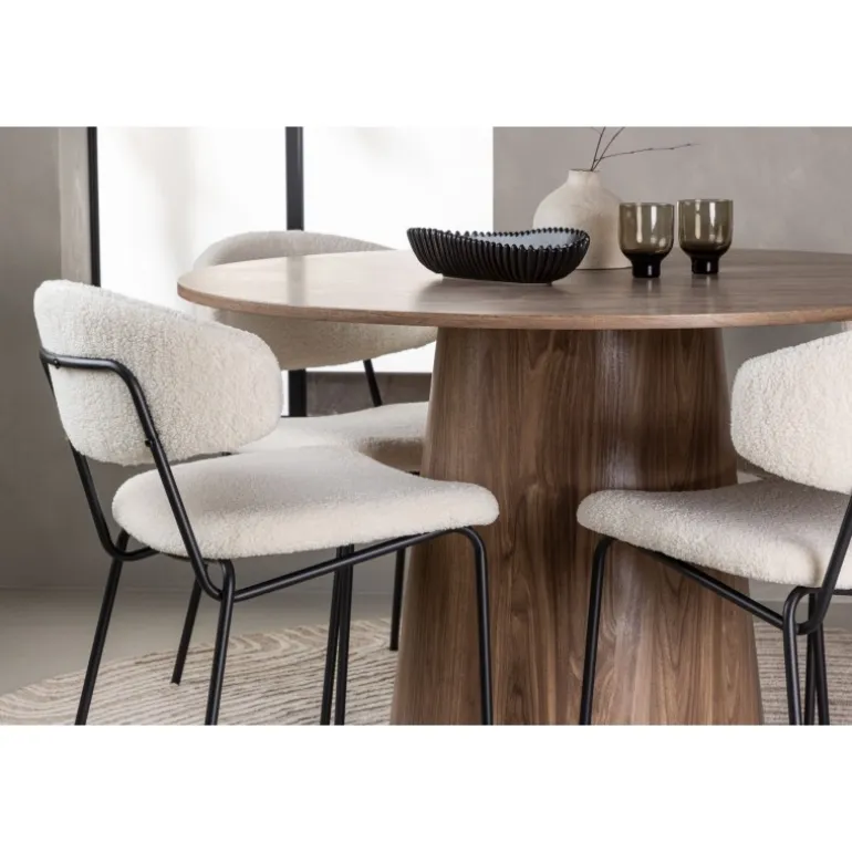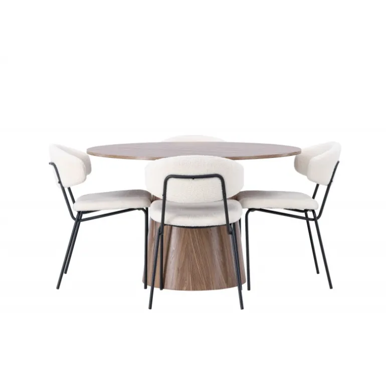 Det skal føles fantastisk at komme hjem! Inviter dine kære til hyggelige middage omkring dette elegante spisebord og sid behageligt i vores moderne spisebordsstole! Vores træfarvede spisebord Lanzo har et konsekvent design med en rund tynd MDF bordplade. Den snoede cylindriske base, som er centralt placeret under bordet, er prikken over i’et og tilføjer et iøjnefaldende element til rummet. Den naturlige farve fremhæver også materialets mønster på en stilfuld måde. Bordet måler 120 cm i diameter. Her i perfekt kombination med vores moderne hvide spisebordsstole Chico. Stolenes minimalisme kombineres perfekt med de bløde runde former og det elegante beige bouclé stof. Sædet og ryglænet er polstret for ekstra komfort under lange middage. Den slanke sorte stålkonstruktion er ikke kun en stilfuld detalje, men også i tråd med de nyeste indretningstrends. Lanzo og Chico er det perfekte par til at skabe en harmonisk og indbydende atmosfære i din spisestue. De komplementerer hinanden på en måde, der fanger opmærksomheden og skaber en unik følelse af stil og komfort – hvad mere kan man ønske sig?