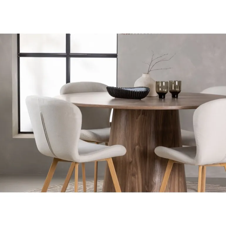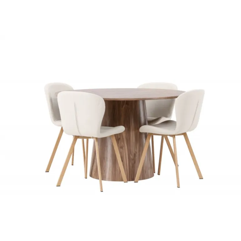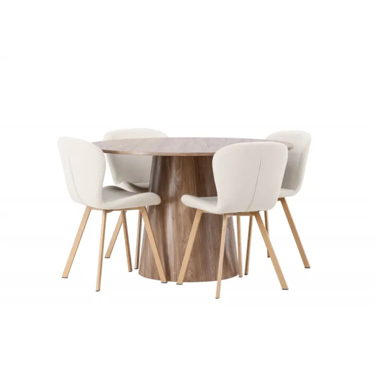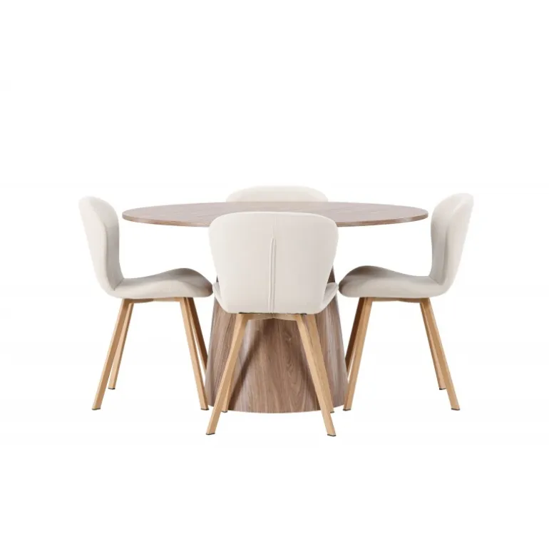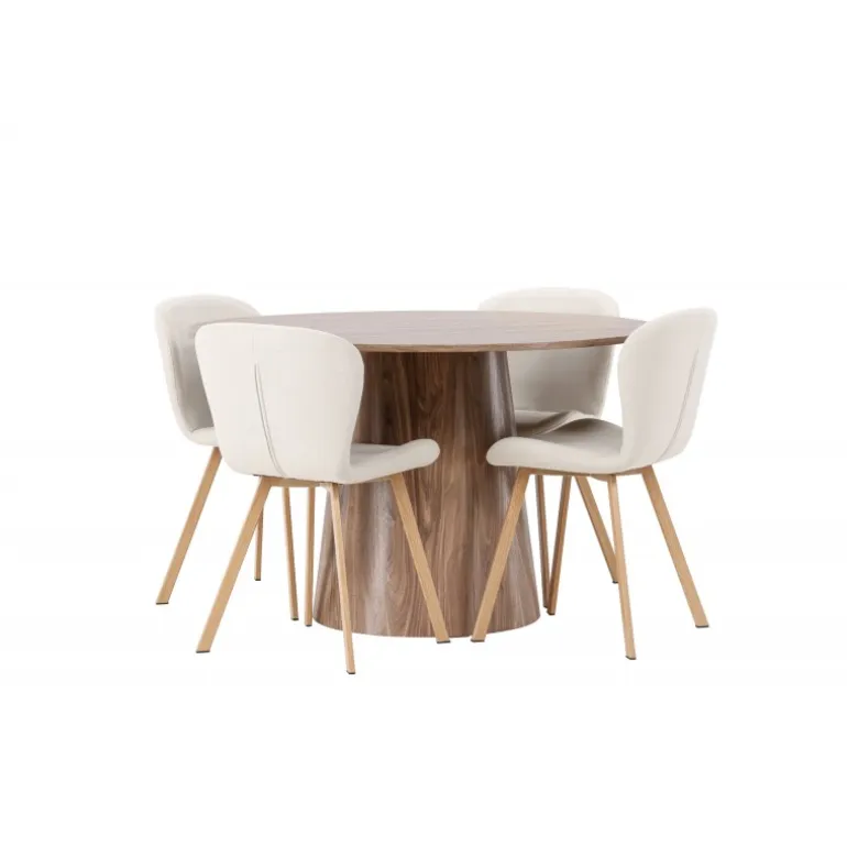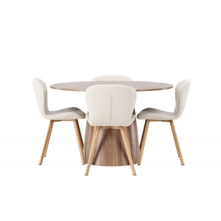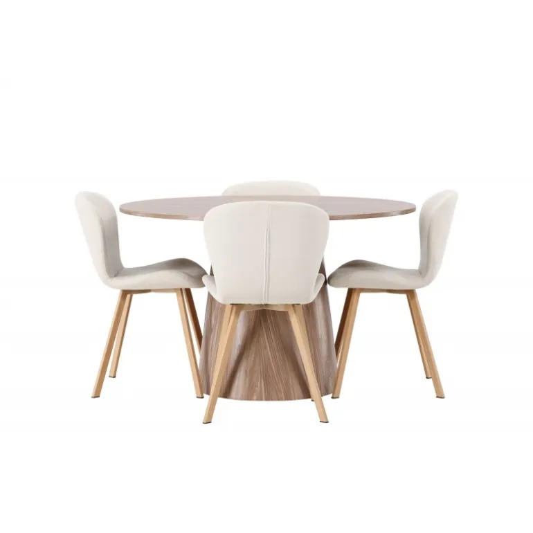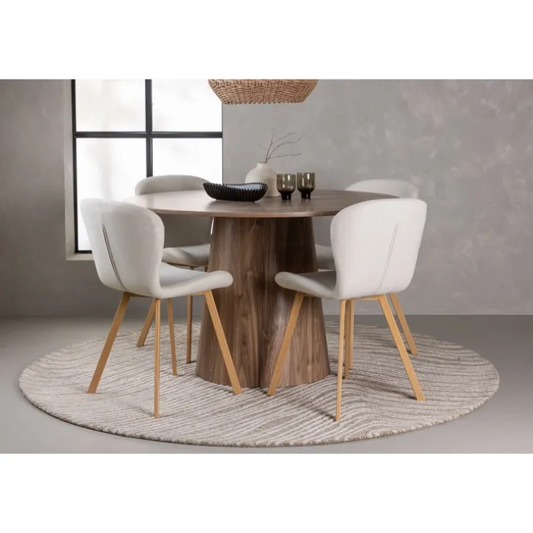 Et charmerende Spisebordssæt med alle de rigtige funktioner! Vores vidunderlige, runde spisebord Lanzo har et komplet MDF-design med en tynd top og en snoet cylindrisk ramme, der er centreret under midten af bordet. Farven er jordnær og gør materialets mønster synligt. Her i en vidunderlig kombination med beige spisebordsstole fra Lilja-serien. Stolen har et rundt design med et sæde i beige polyesterstof og let udvidede stoleben i sort metal. Indret stuen smart og indbydende! Bordets diameter: 120 cm.