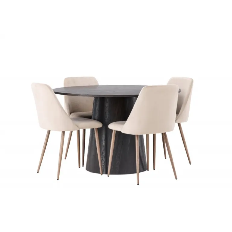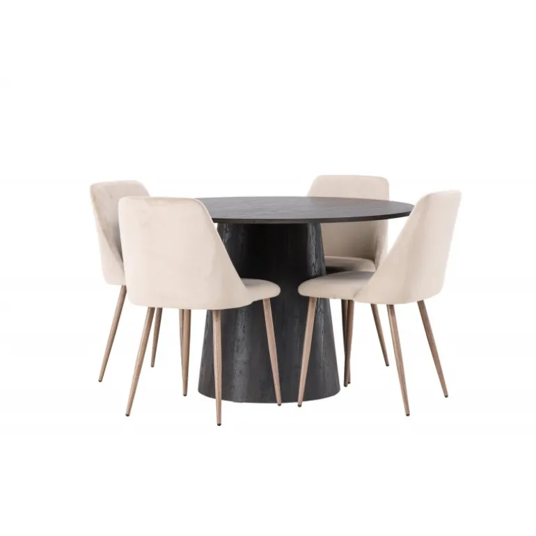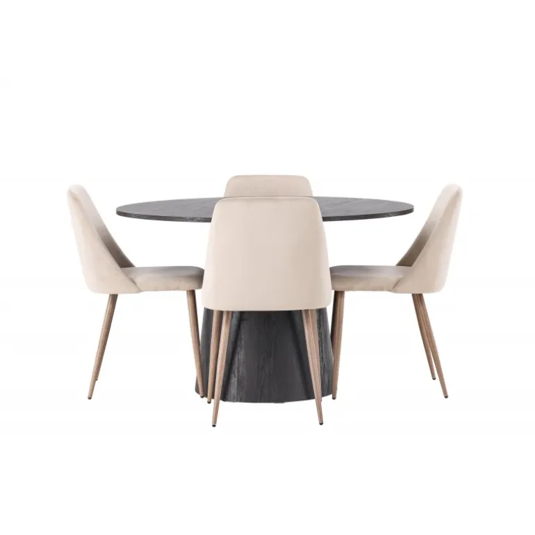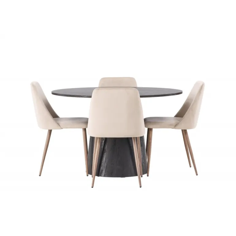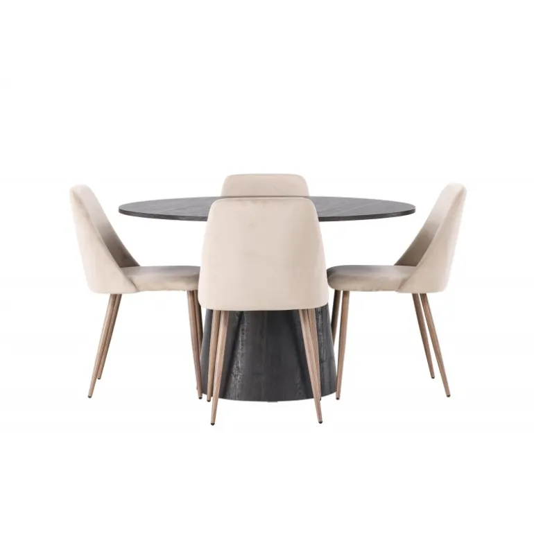 Varme toner og charmerende design! Vores vidunderlige, runde spisebord Lanzo har et overordnet design i brun MDF med en tynd top og en snoet cylindrisk ramme, der er centreret under midten af bordet. Her sammen med vores sandfarvede spisestole fra serien Night. Stolen har en fuldt polstret sæde i brunt velourstof og stolben i valnøddefarvet stål. Kort sagt, et fantastisk Spisebordssæt! Bordets diameter: 120 cm.