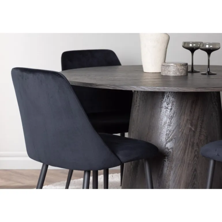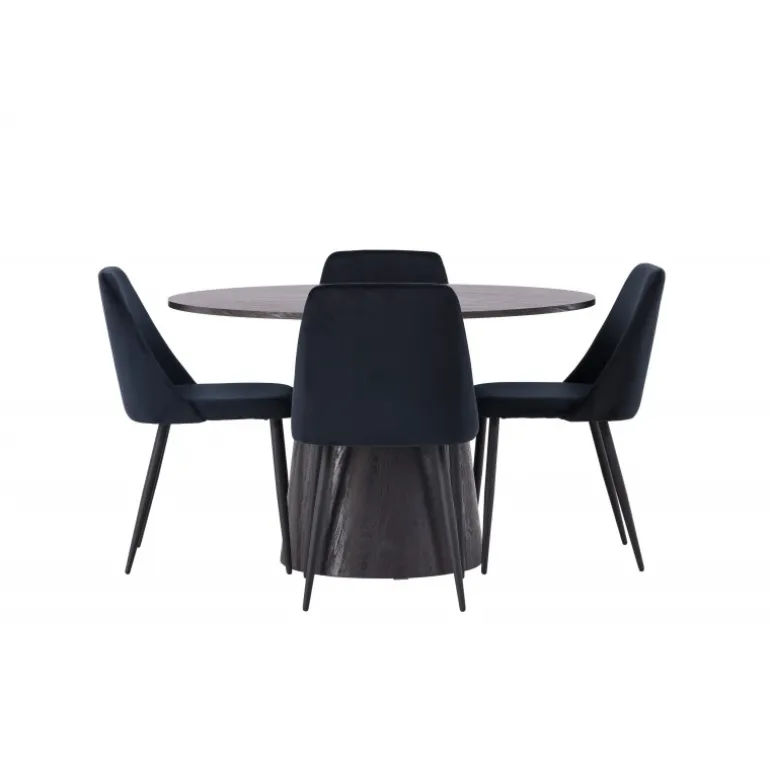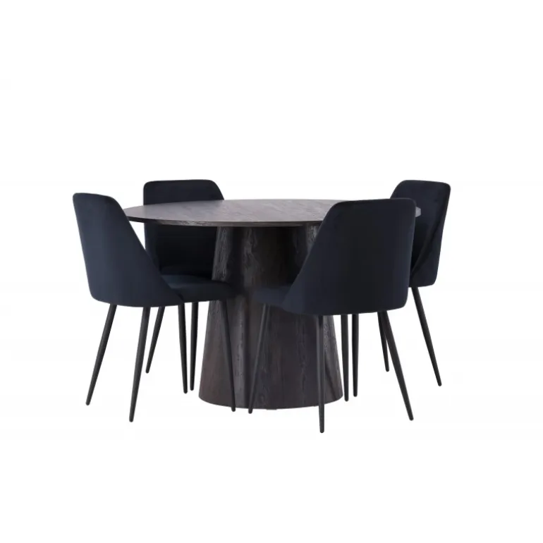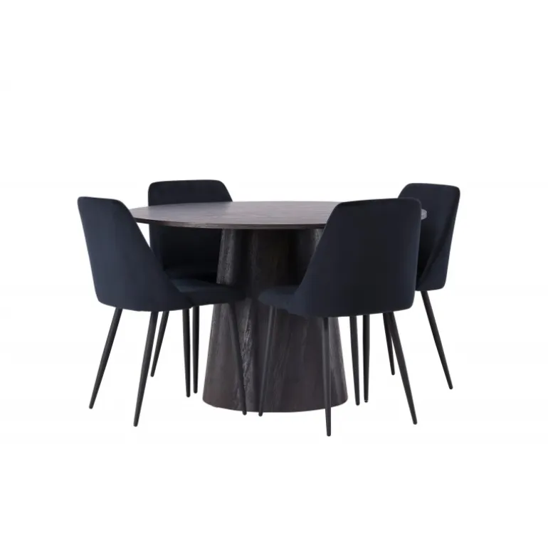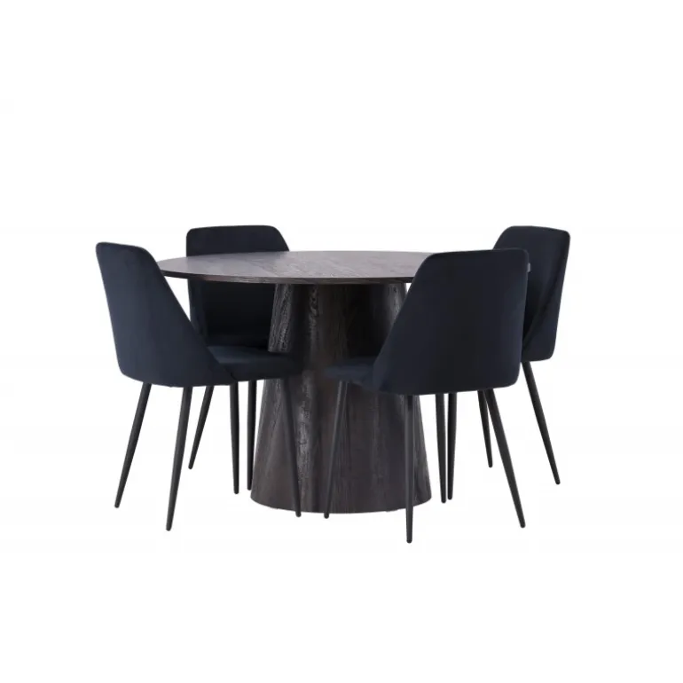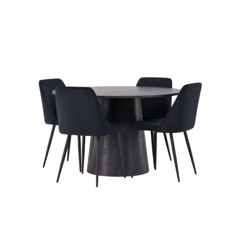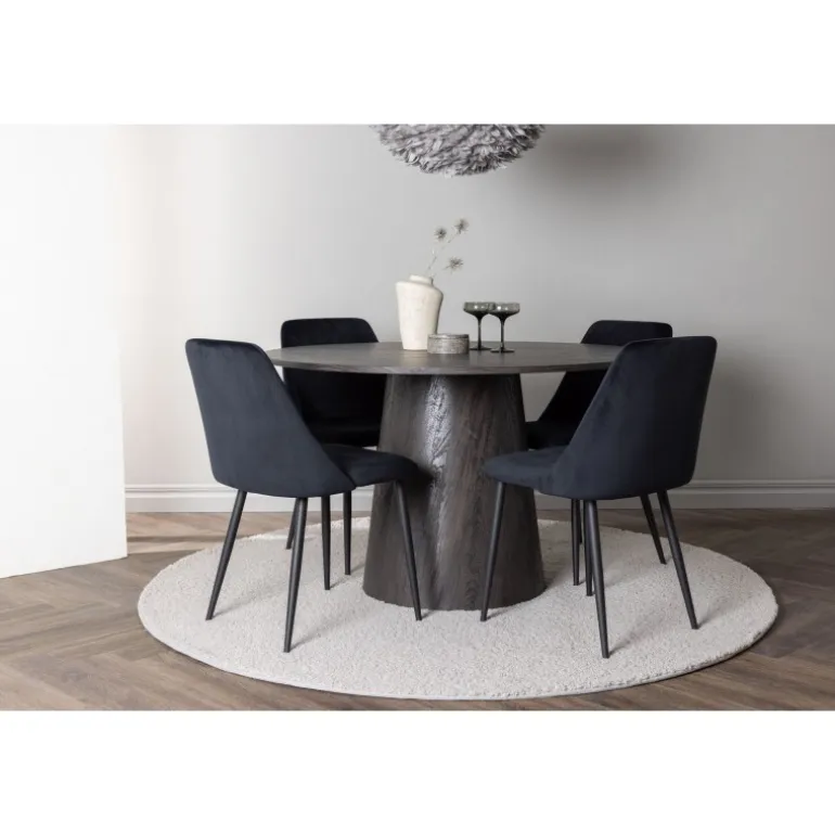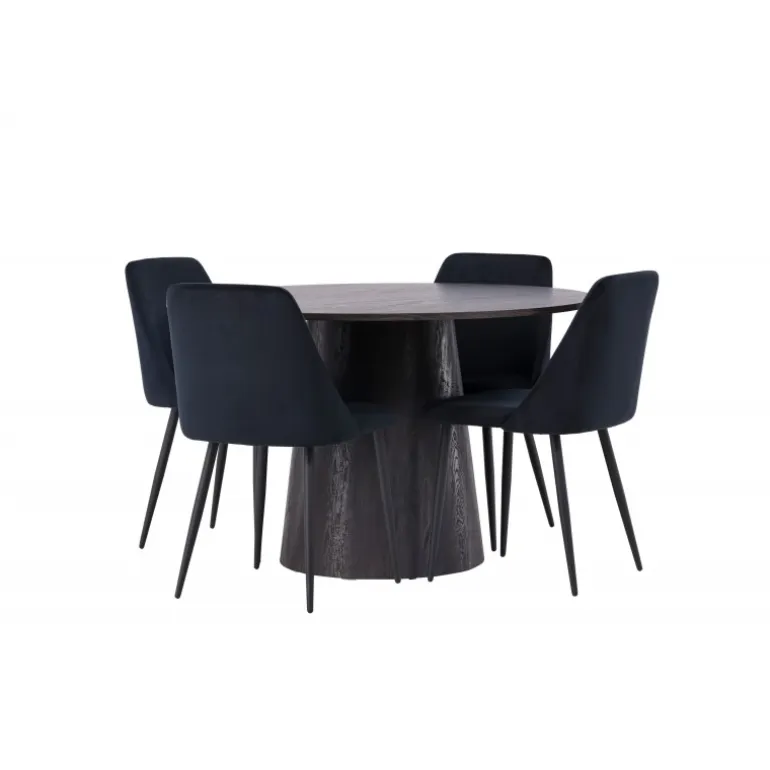 Skab en indbydende atmosfære! Vores vidunderlige, runde spisebord Lanzo har et design i brun MDF med en tynd bordplade og en snoet cylindrisk ramme, der er centreret under midten af bordet. Her i perfekt kombination med sorte spisestuestole fra serien Night. Stolen har en fuldt polstret sæde i sort velourstof og ben i matchende sort farve. Her sidder du så komfortabelt som moderne! Bordets diameter: 120 cm.