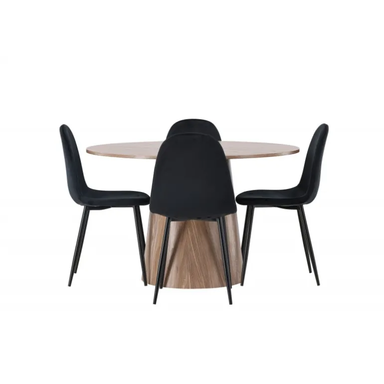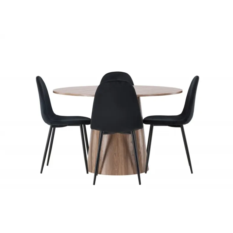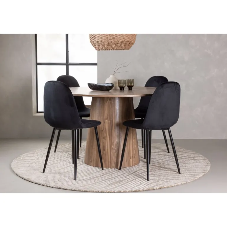 Indret smukt, smart og stilfuldt med et moderne Spisebordssæt i træmateriale og velourstof – den perfekte kombination af luksus og komfort! Vores træfarvede spisebord Lanzo har et konsistent design med en rund top lavet af tynd MDF. Den snoede cylinderformede base, centralt placeret under bordet, tilføjer et øjekast og skaber bevægelse i rummet. Den naturlige farve fremhæver også elegant materialets mønster. Bordet har en diameter på 120 cm. Sammen med det træfarvede spisebord Leo tilbyder vi vores sorte spisebordsstole Polar. Disse stole er omhyggeligt designet og tilbyder en perfekt balance mellem stil og komfort. De har et fuldt polstret design, og sædet er lavet af blødt sort velourstof, hvilket giver en luksuriøs følelse. De sort pulverlakerede metalben tilføjer et moderne touch og sikrer god stabilitet. Inviter nære venner og familie til hyggelige måltider, hvor ingen risikerer at ende på kanten!