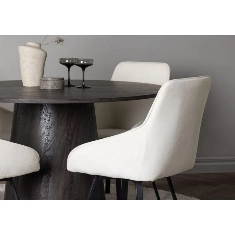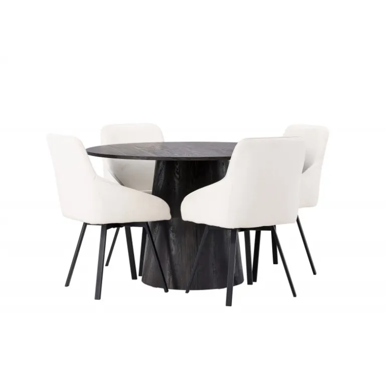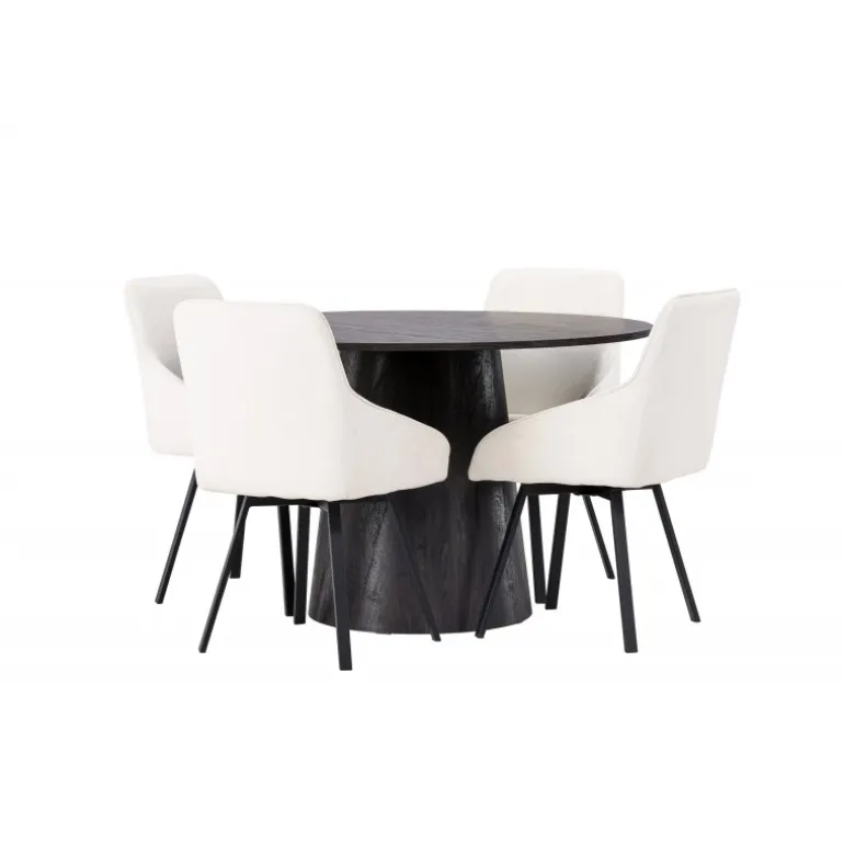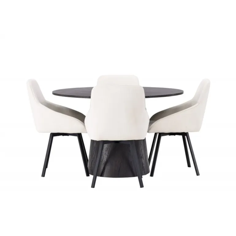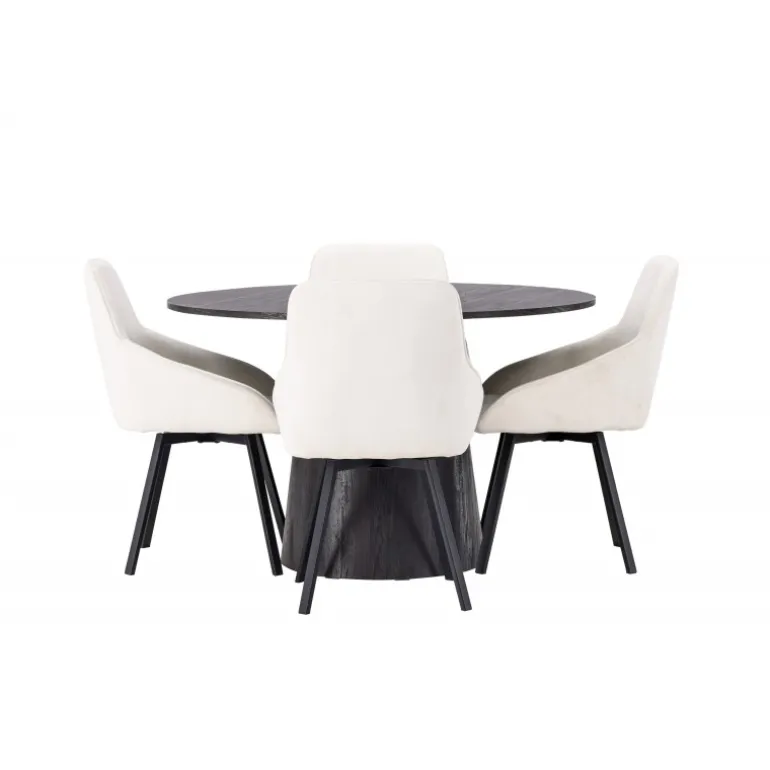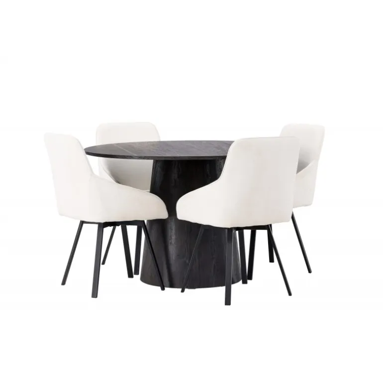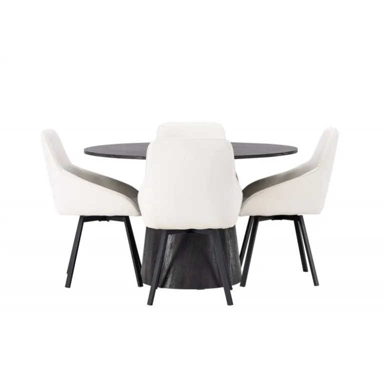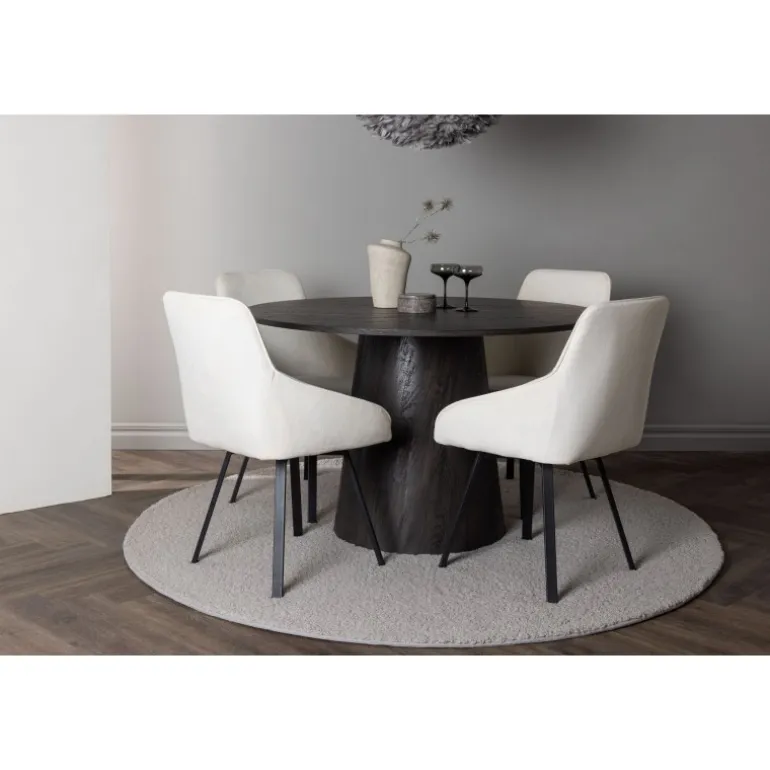 Dette Spisebordssæt udstråler luksus og bekvemmelighed! Vores vidunderlige, runde spisebord Lanzo har et overordnet design i brun MDF med en tynd top og en snoet cylindrisk ramme, der er centreret under midten af bordet. Her i stilfuld kombination med beige spisestole fra Rosie-serien. Stolen har et fuldt polstret sæde med integrerede armlæn i beige stof og let udadgående stoleben i sort metal. Det bløde sæde er polstret for ekstra komfort og inviterer til lange hyggelige middagsøjeblikke. Bordets diameter: 120cm.