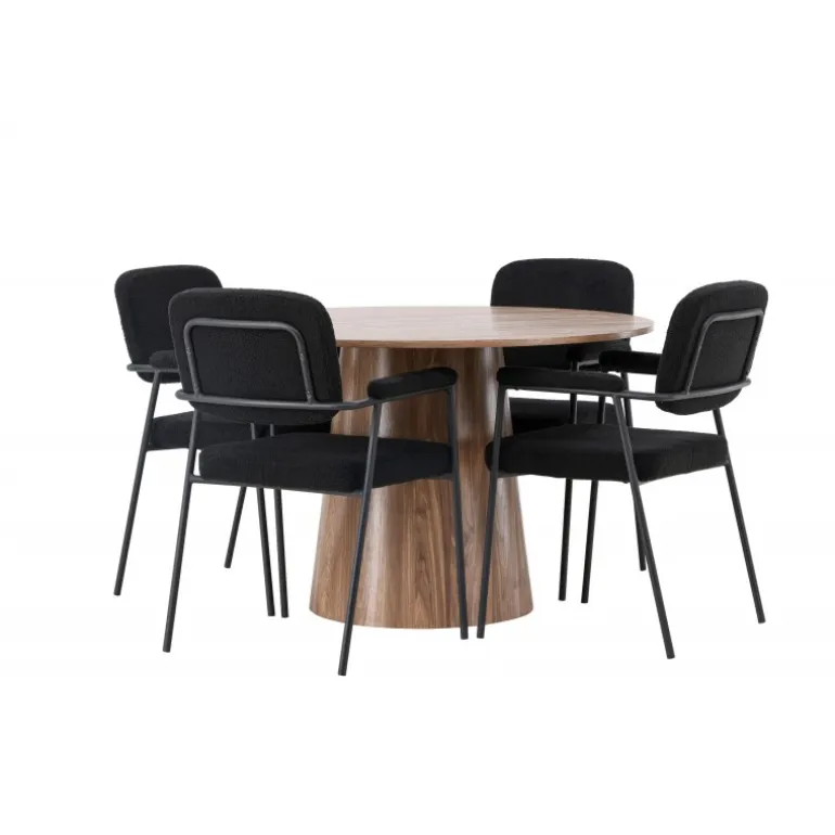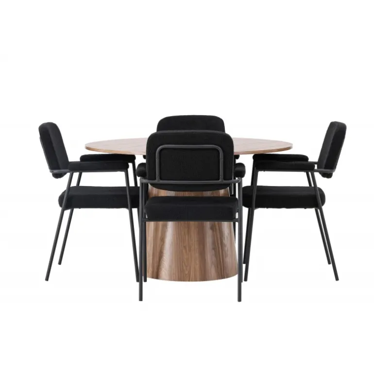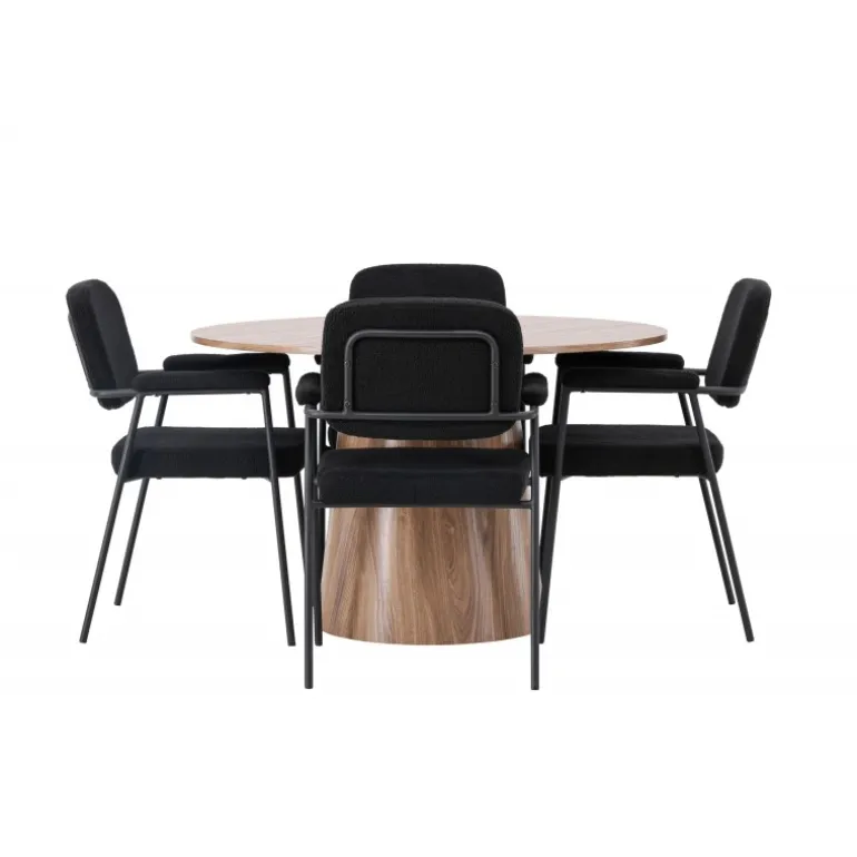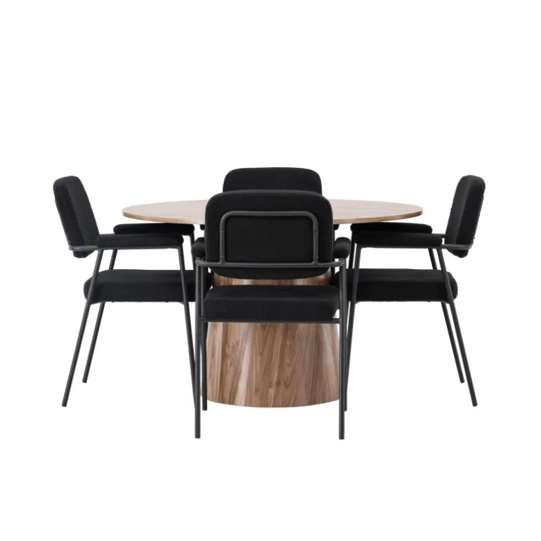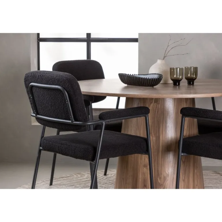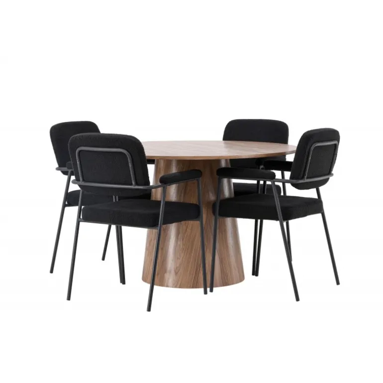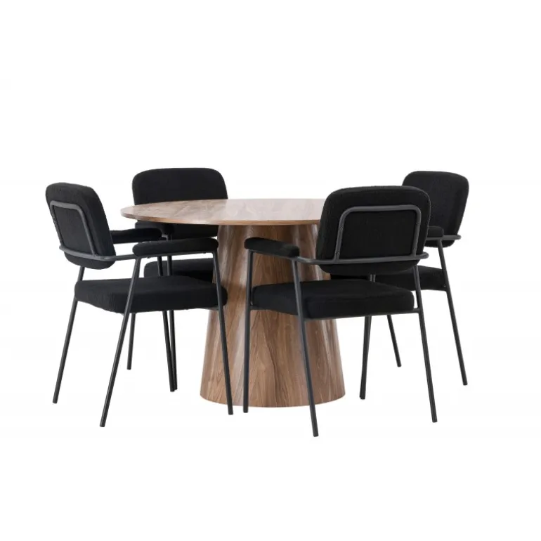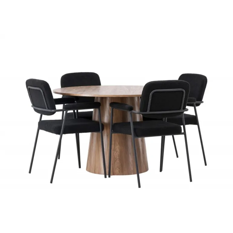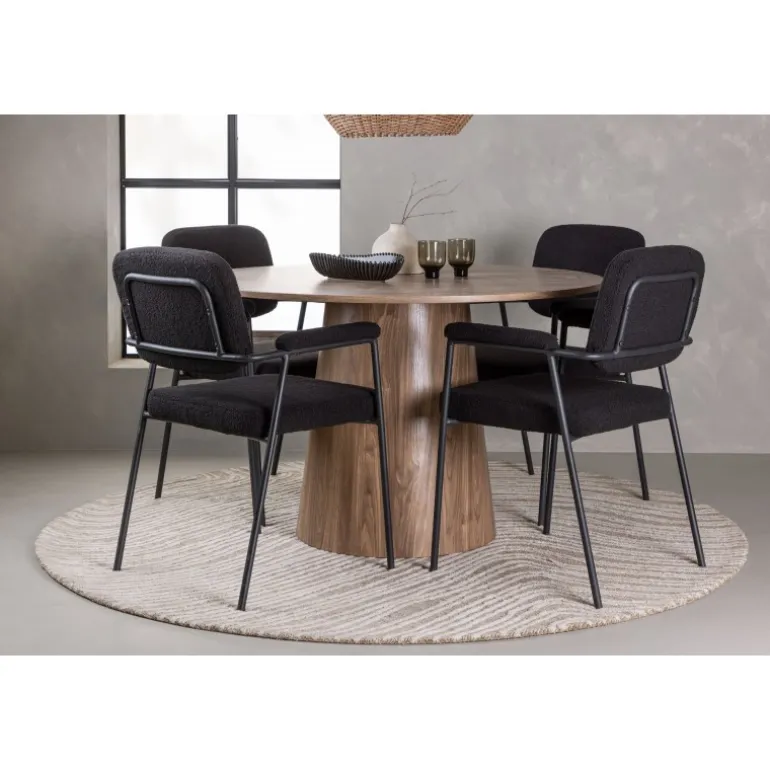 Indret dit hjem indbydende, stilfuldt og moderne med et Spisebordssæt, der udstråler modernitet og komfort! Vores træfarvede spisebord, Lanzo, imponerer med sit skandinaviske design og smagfulde håndværk. Bordet er lavet af MDF og har en rund bordplade samt en robust snoet cylindrisk base, der er centreret under midten af bordet. Den jordfarvede farve fremhæver materialets smukke mønster og skaber en harmonisk atmosfære. Bordet måler 120 cm i diameter. For at komplementere det stilfulde spisebord kombinerer vi det med sorte spiseborde fra Yesterday-serien. Disse trendy og komfortable spiseborde er tidløse. Stolen har et fuldt polstret sæde i sort bouclé stof, hvilket giver en elegant og luksuriøs følelse. De slanke sorte metalben giver ikke kun stabilitet, men de integrerede armlæn tilbyder også ekstra komfort og støtte. Med Lanzo spisebordet og stolene fra Yesterday-serien får du ikke kun et praktisk og funktionelt Spisebordssæt, men også en stilfuld og elegant interiørdetalje, der vil gøre dig stolt af dit hjem!