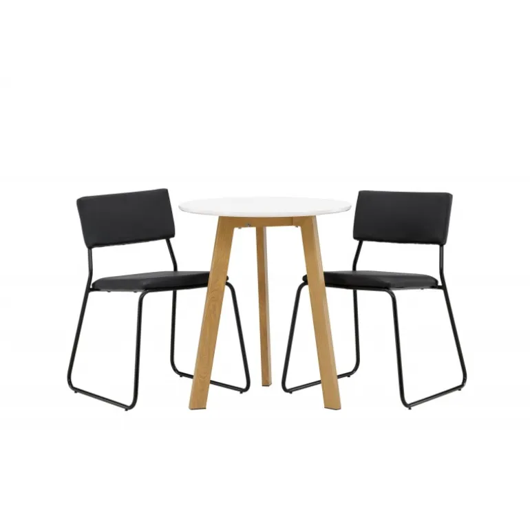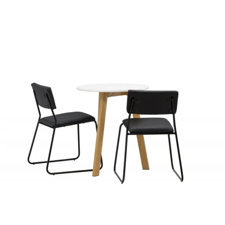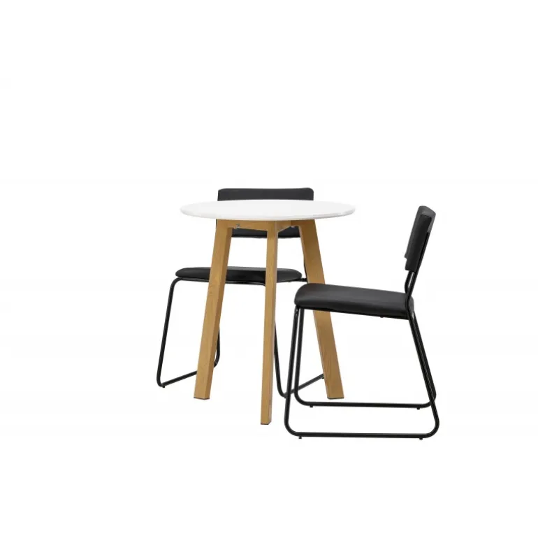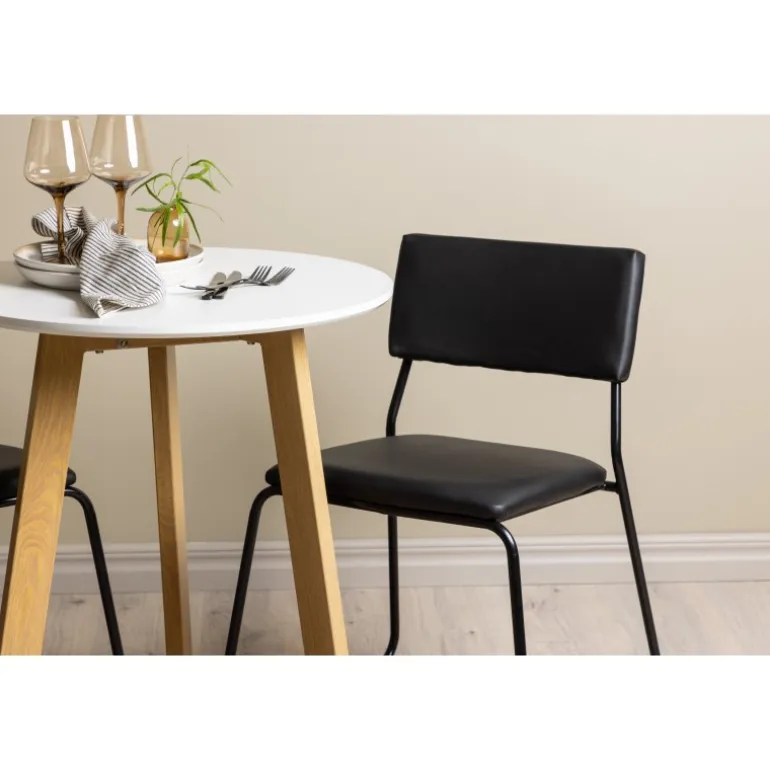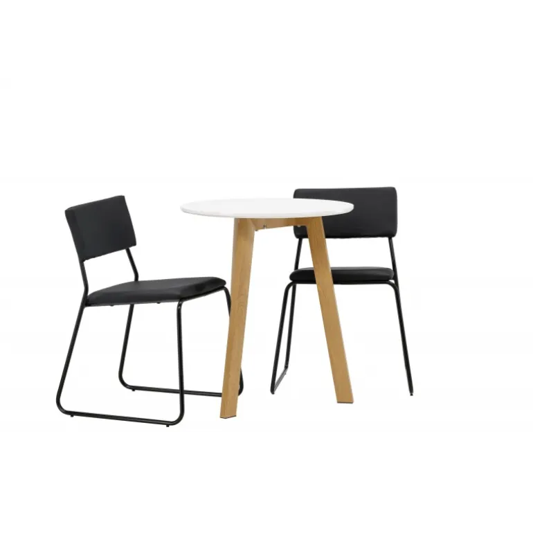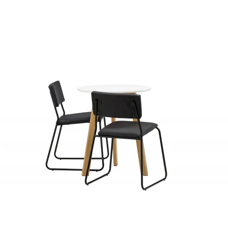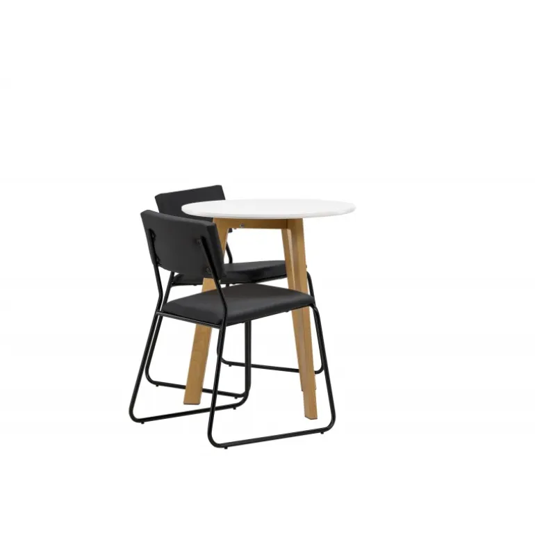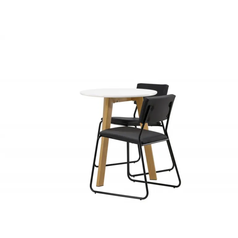 En vidunderlig kombination af minimalisme og klassisk design! Det runde spisebord Leonora har en rund top i hvid MDF og en trebenet ramme i en dejlig egetræslook. Her i perfekt match med minimalistiske spisebordsstole fra serien Kenth. Stolen har en ryg og sæde i sort polyuretanlæder og polyester samt dekorative smalle ben i jern. Hvorfor ikke indrette både smart og stilfuldt? Bordets diameter: 65 cm.
