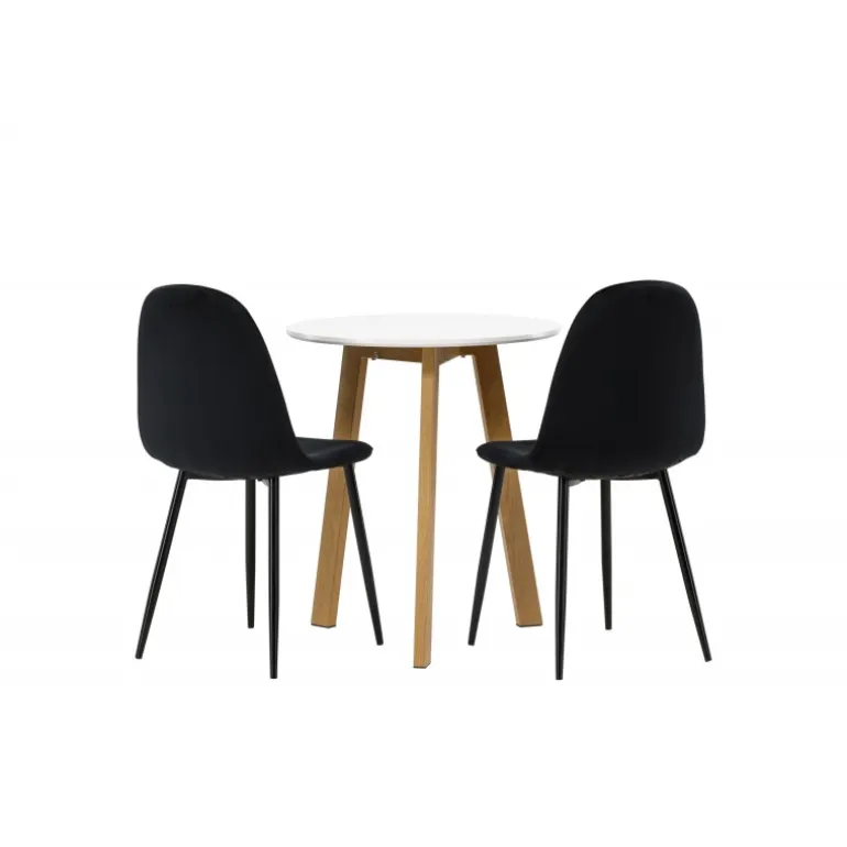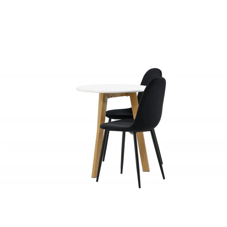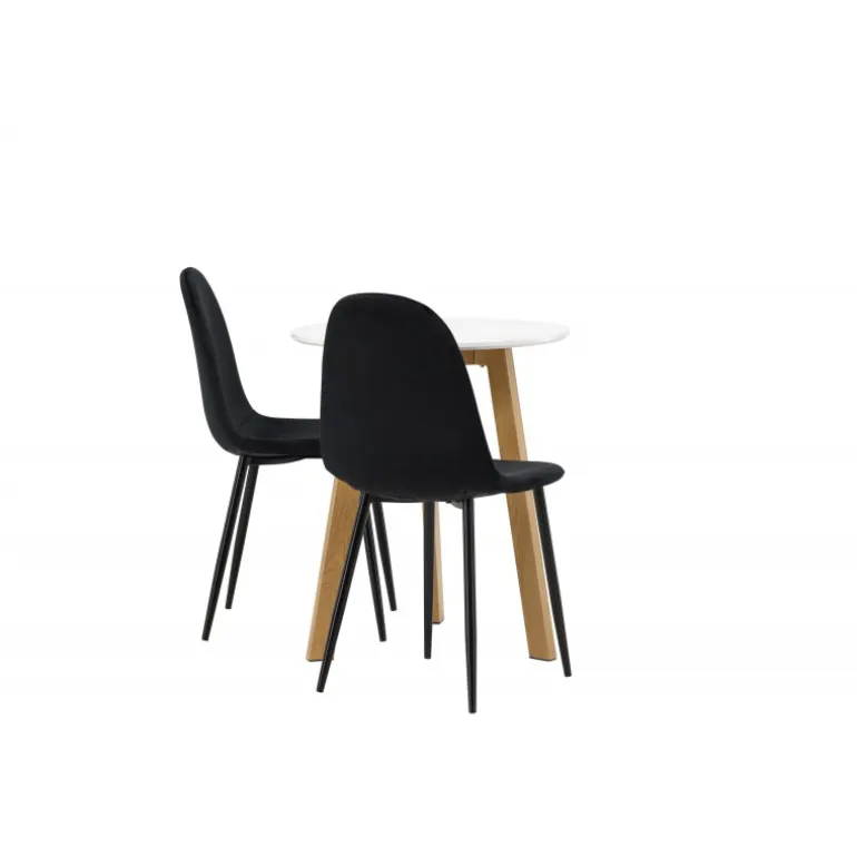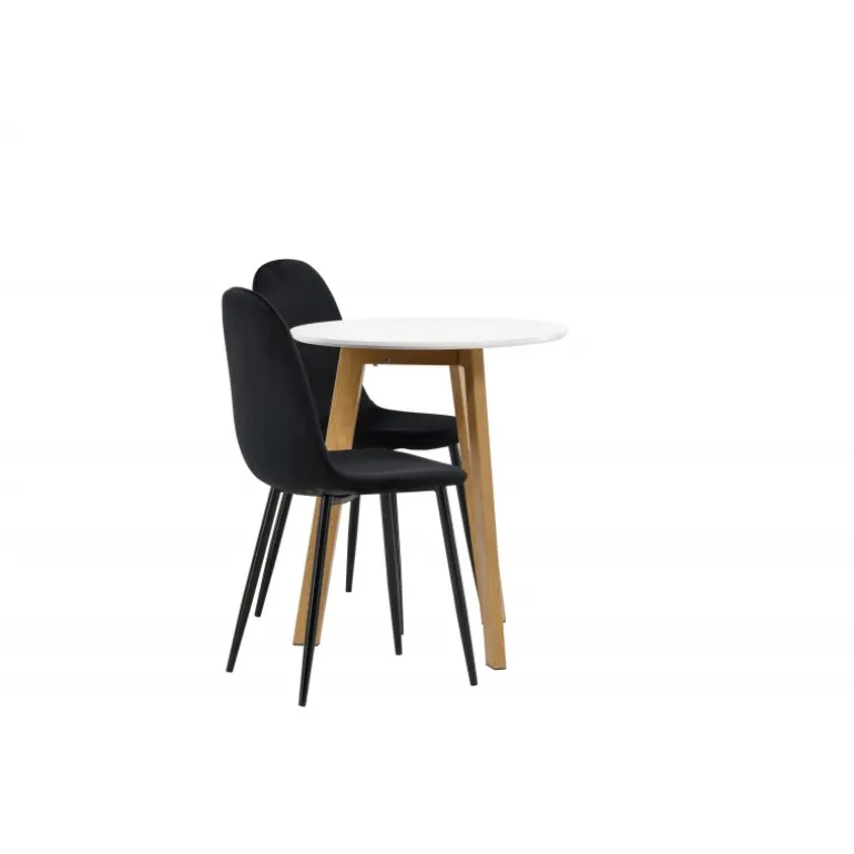 Et perfekt Spisebordssæt til det mindre køkken! Det runde spisebord Leonora har en rund bordplade i hvid MDF og en trebenet ramme i en dejlig egetræslook. Her i fantastisk kombination med sorte spisestole fra Polar-serien. Stolen har et fuldt polstret design, ben i sort pulverlakeret metal og en rundet ryg og sæde i sort fløjl med blød polstring. Sid komfortabelt og nyd lækre måltider! Bordets diameter: 65 cm.