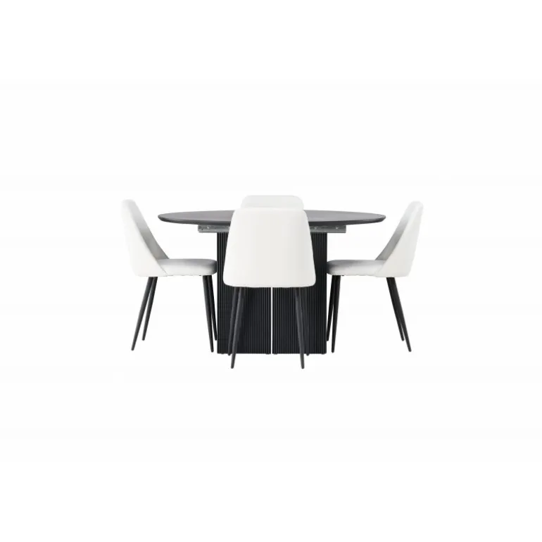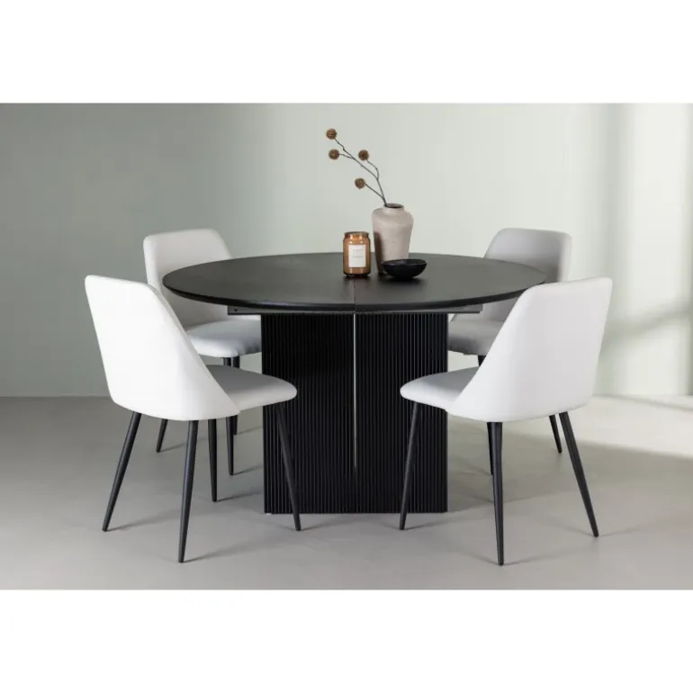 Giv dit hjem en touch af elegance og funktionalitet med dette stilfulde og smarte Spisebordssæt, der kombinerer Matilda spisebord og Night stole. Vores runde spisebord Matilda er en perfekt løsning for dem, der ønsker at tilpasse deres spisebord efter behov. Med en rund bordplade i sort fineret MDF og robuste blokformede ben får du et stilfuldt og holdbart design. Det bedste af det hele er, at Matilda nemt kan forvandles til et længere, ovalt spisebord, når du har brug for ekstra plads til dine gæster. Bordets diameter måler 130 cm. For at komplementere dit spisebord har vi matchet det med hvide stole fra Night serien. Denne stol tiltrækker opmærksomhed og imponerer med sit skandinaviske design. Stolen har et fuldt polstret sæde i hvidt PU-læder, hvilket tilføjer en følelse af luksus og elegance til din spisestue. Stolebenene er lavet af sort stål, hvilket giver en stærk og stabil konstruktion samtidig med, at det tilføjer et moderne præg. Med Matilda spisebordet og Night stolene skaber du en perfekt harmoni i din spisestue. Lad Matilda forlænge sig for at byde flere gæster velkommen og nyd det vidunderlige selskab omkring dette elegante bord!