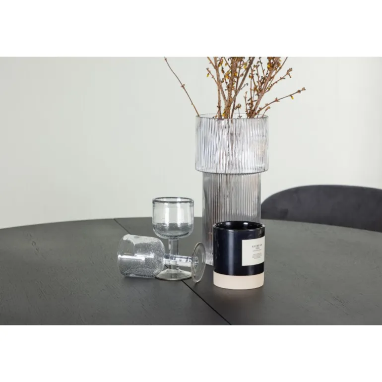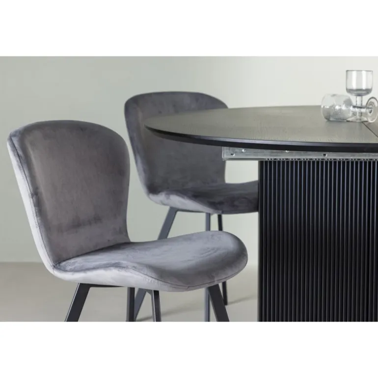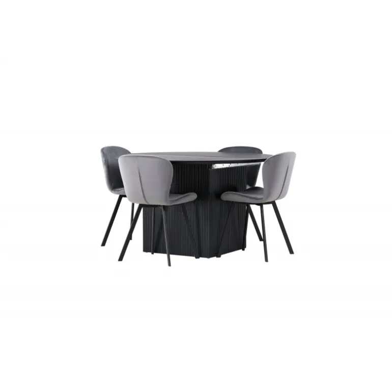Skab en smart og elegant atmosfære i dit hjem med et udtrækkeligt Spisebordssæt i sort farve! Med det runde spisebord Matilda får du ikke kun en smuk indretningsdetalje, men også en praktisk løsning til at rumme flere gæster. Bordpladen er lavet af sort MDF med finer, og den robuste base består af to blokformede ben, der giver god stabilitet til bordet. Den udtrækkelige bordplade omdanner hurtigt bordet til en oval form, så du undgår bekymringer om, hvorvidt alle kan være der. Bordet måler 130 cm i diameter. For at skabe et komplet Spisebordssæt har vi parret spisebordet med de elegante stole fra Lilja-serien. Med deres smidige, afrundede form og grå polyesterstofsæder tilbyder Lilja en komfortabel og stilfuld siddeplads. De let spredte sorte metalben på stolene tilføjer et moderne og elegant touch til det samlede indtryk. Giv hjertet af dit hjem et personligt præg og nyd fleksibilitet, stil og komfort med Matilda spisebordet og Lilja stolene!