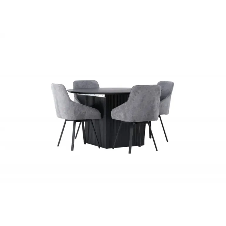 Forvandl din stue til et rum med både stil og funktionalitet med dette fantastiske og udtrækkelige Spisebordssæt! Vores runde spisebord Matilda kan hurtigt forvandles til et ovalt bord med sin udtrækkelige funktion. Med en rund top i sort MDF med finer og robuste, blokformede ben tilføjer Matilda også et moderne og elegant touch til dit hjem. Bordets diameter er 130 cm. Her har vi matchet det sorte spisebord Matilda med vores vidunderlige grå spisestole Rosie. Disse stole i skandinavisk design har fuldt polstrede sæder med integrerede armlæn i gråt stof og let udadbuede stoleben i sort metal. Det bløde sæde er polstret for ekstra komfort, så du kan nyde lange og behagelige middage med lethed. Giv dit hjem en stilfuld opdatering og skab en atmosfære af elegance og funktionalitet, mens du giver dig selv og dine gæster en følelse af stil og komfort!