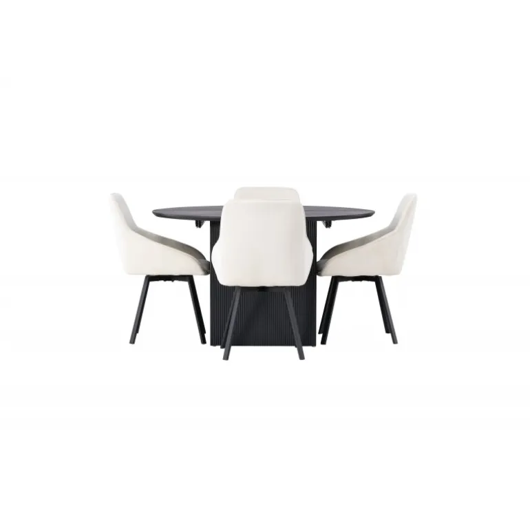 Et stilfuldt Spisebordssæt, der føles lige så klogt som det er gennemtænkt med sit modebevidste design, smarte funktioner og justerbare størrelse! Vores runde spisebord Matilda kan hurtigt omdannes til et ovalt bord med sin udvidelige funktion. Med en rund bordplade i sort MDF finer og robuste, blokformede ben tilføjer Matilda også et moderne og elegant touch til dit hjem. Bordet måler 130 cm i diameter. Her har vi kombineret det sorte spisebord Matilda med vores vidunderlige beige spisebordsstole Rosie. Disse stole i skandinavisk design har en fuldt polstret sæde med integrerede armlæn i beige stof og let skråtstillede stoleben i sort metal. Det bløde sæde er polstret for ekstra komfort, hvilket gør det muligt for dig at nyde lange og behagelige middage med lethed. Giv dit hjem en stilfuld opdatering og skab en atmosfære af elegance og funktionalitet, samtidig med at du giver dig selv og dine gæster en følelse af stil og komfort!