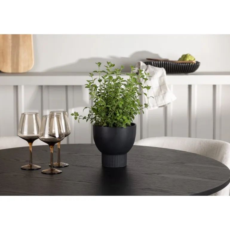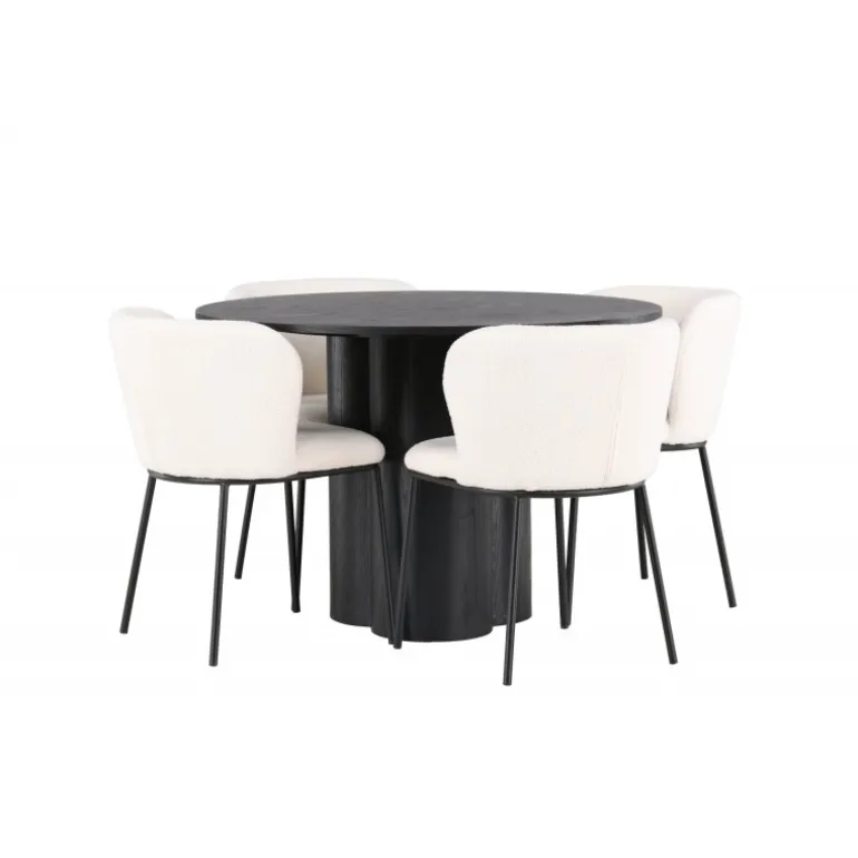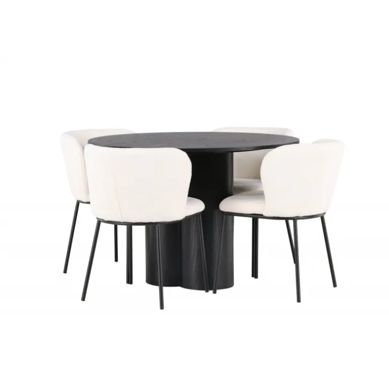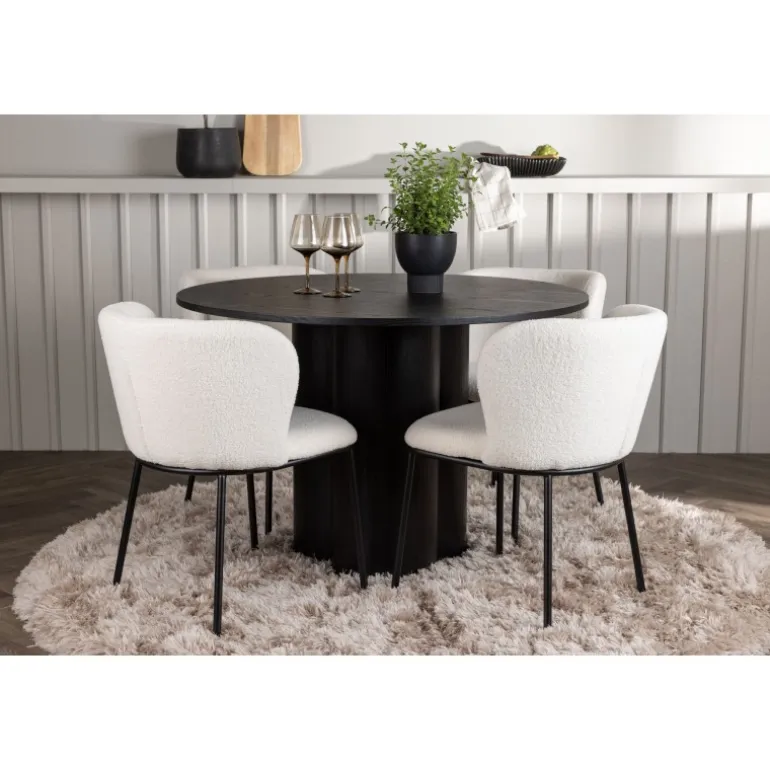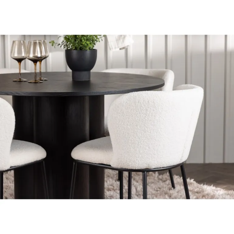 Velkommen til et Spisebordssæt, der kombinerer stil, komfort og elegance! Dette Spisebordssæt skaber hurtigt en perfekt harmoni mellem design og funktionalitet, der vil forvandle din stue til et charmerende midtpunkt. Vores runde spisebord, Olivia, imponerer med sit unikke design. Bordet har en slank bordplade og er lavet af sort fineret MDF med en let tekstureret overflade, der fremhæver materialets smukke mønster. De tre cylinderformede ben, samlet i midten af bordet, giver en stabil base og tilføjer et moderne touch til designet. Bordets dimensioner: 110 cm. Her, i perfekt kombination, er spisestolene fra Edina-serien. Disse stole kombinerer et fleksibelt og fuldt polstret sæde i hvid bouclé stof med minimalistiske sorte metalben. Det slanke design tilbyder en tidløs følelse, og det komfortable sæde sikrer, at du og dine gæster kan nyde lange og behagelige middage. Skab en atmosfære af stil og hygge i dit hjem med dette smukke Spisebordssæt, der garanterer, at du og dine gæster vil sidde så komfortabelt som luksuriøst!