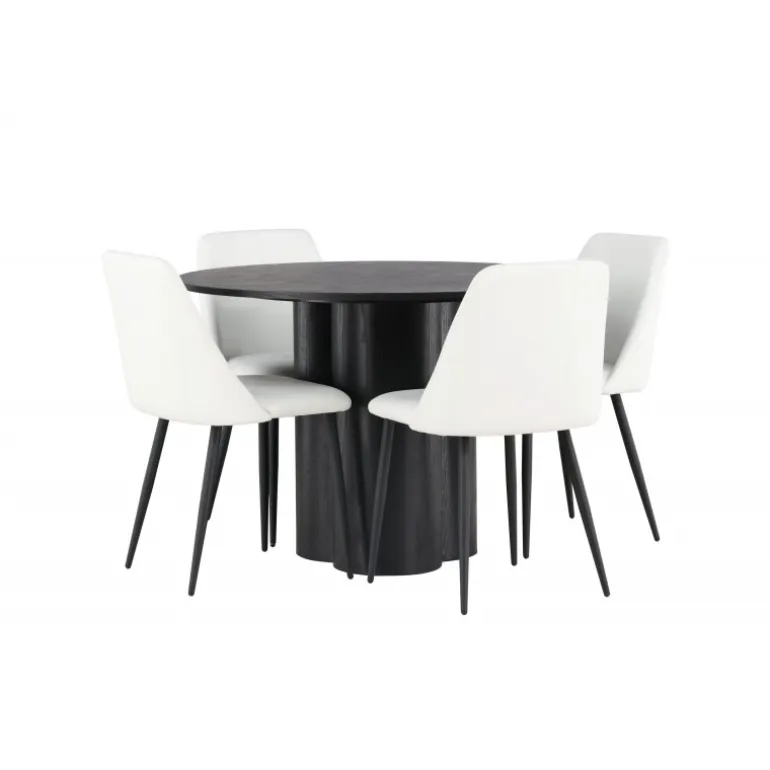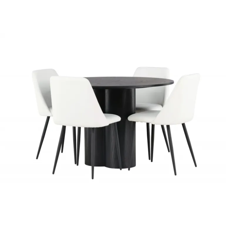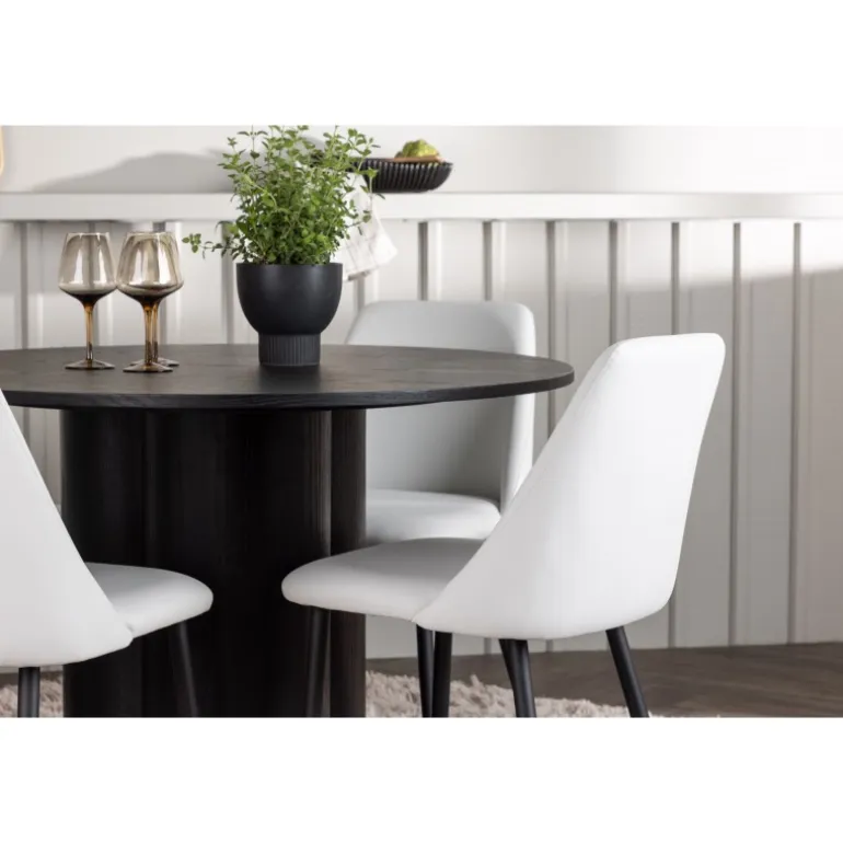 Kombiner farver og materialer som i dette Spisebordssæt, og bemærk, hvordan niveauet af stil i dit hjem løftes! Vores runde spisebord Olivia er et mesterværk af design og funktionalitet. Bordet kommer i en røgfarvet sort farve og har en slank, rund bordplade. De tre cylinderformede ben, elegant placeret under midten af bordet, giver et solidt og balanceret fundament. Fremstillet udelukkende af bæredygtigt MDF. Bordets dimensioner: 110 cm. Her i en vidunderlig kombination med vores hvide stole fra Night-serien. Den hvide PU-polstring giver en følelse af eksklusivitet og desuden fantastisk komfort. Stolens sorte stålben er ikke kun robuste, men bidrager også til dens moderne og distinkte udseende. Takket være det polstrede sæde kan du sidde ved spisebordet i lang tid uden at gå på kompromis med komforten. Med dette Spisebordssæt kan du skabe en atmosfære, der udstråler tidløs elegance og eksklusivitet. Hvert eneste detalje er nøje udvalgt for at give dig den bedste kombination af stil og komfort, så lad dit hjem stråle af dette og indret det indbydende i fremtiden!