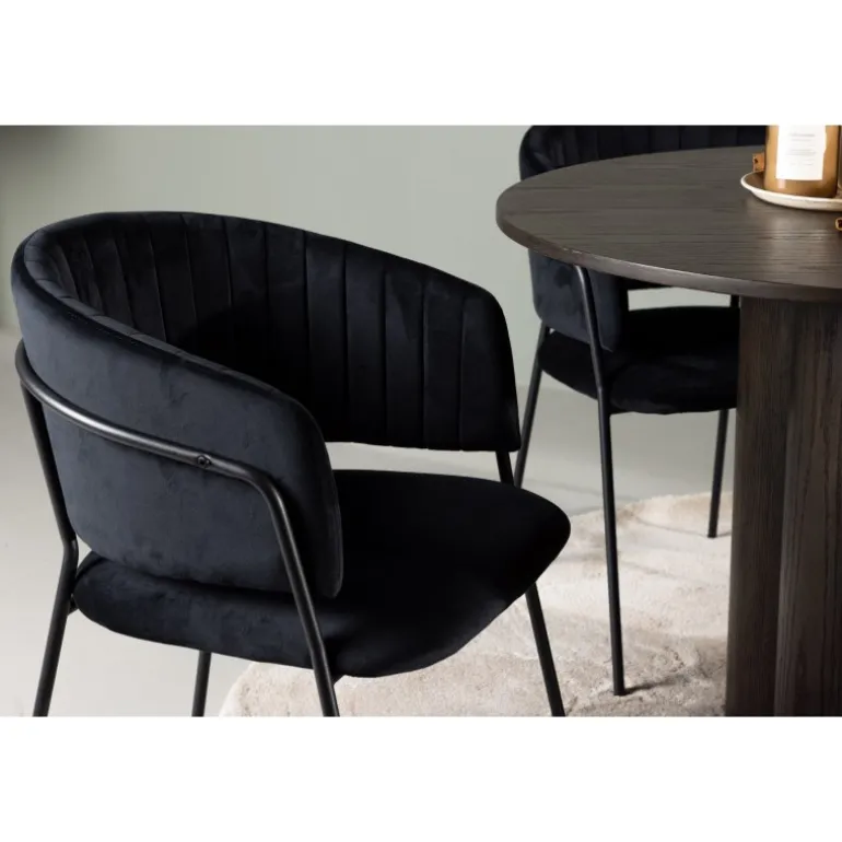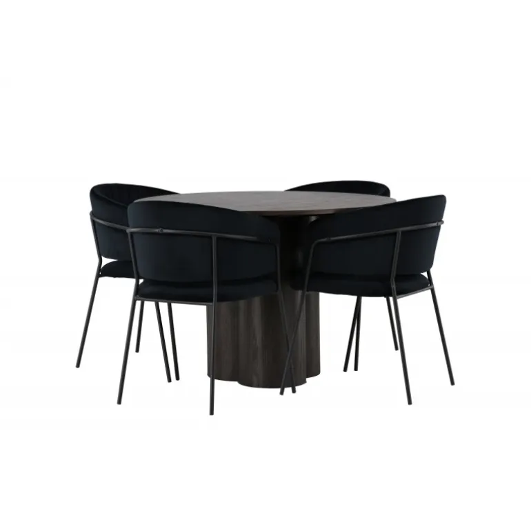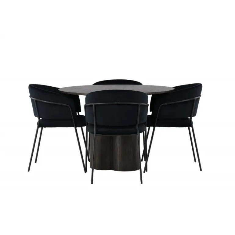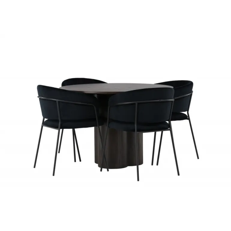 En elegant midtpunkt i stuen og høj komfort til alle sociale måltider – hvad mere kunne man ønske sig? Det slanke spisebord Olivia fremhæver moderne, jordnære toner i en luksuriøs mokkafarve og et gennemtænkt design, der skiller sig ud. Den tynde og runde MDF-bordplade giver et diskret strejf af elegance, mens de tre cylinderformede ben, der er centralt placeret under bordet, skaber en afbalanceret og stilfuld æstetik. Bordets diameter: 110 cm. Her er spisebordet parret med slanke spisestole fra Selma-serien for at fuldende din oplevelse af komfort og stil. Disse stole har et omsluttende design med en let rundet ryg og et blødt velourpolstret sæde. De dekorative syninger tilføjer et strejf af luksus, og de sorte stålstoleben er ikke kun elegante, men giver også stabilitet og støtte. Oplev et nyt niveau af elegance og komfort med dette indbydende Spisebordssæt. Skab en atmosfære, der garanteret vil inspirere til fællesskab, uden nogen risiko for at ende på kanten. Lad din spiseoplevelse blive enestående med denne moderne kombination af design og komfort!