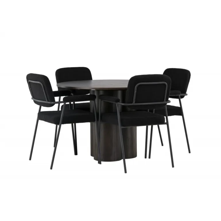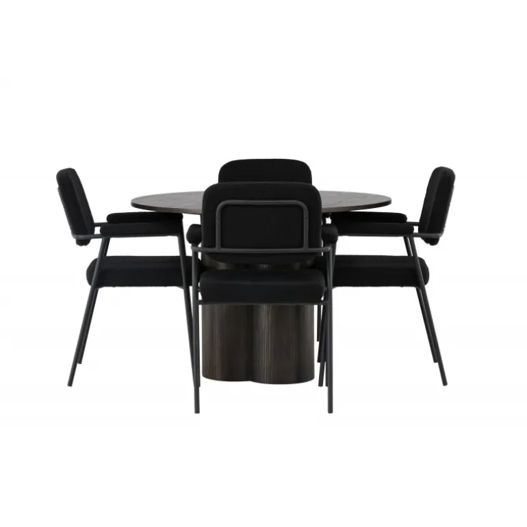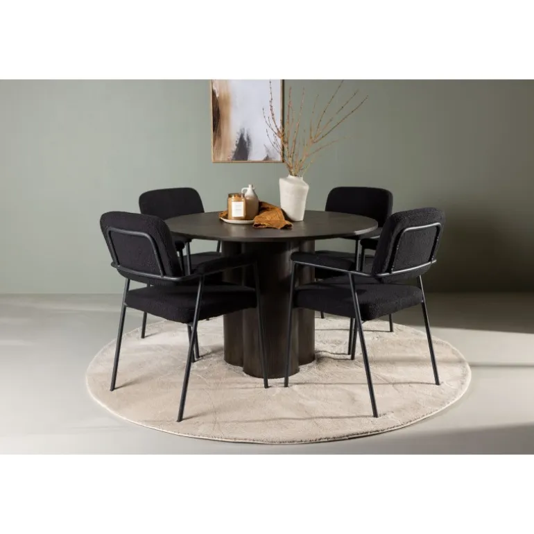 Med sine smagfulde detaljer og unikke design vil dette Spisebordssæt give dig en følelse af luksus og hygge ved hvert måltid! Vores mørkebrune spisebord, Olivia, er lavet af høj kvalitet MDF-materiale, der holder til tidens tand. Bordet har en tynd og rund bordplade, der tilføjer et moderne touch, og tre cylinderformede ben samlet i midten, hvilket giver stabilitet til udseendet. Bordets dimensioner: 110 cm. Sammen med det runde spisebord Olivia medfølger vores sorte bouclé stof spisestole fra Yesterday-serien. Det skandinaviske design forstærkes af det fuldt polstrede sæde i sort bouclé stof, hvilket tilføjer et strejf af luksus og modernitet. De slanke stoleben med integrerede sorte metalarmlæn er ikke kun visuelt tiltalende, men tilbyder også ekstra støtte og komfort under lange og hyggelige middage. Sæt dig ned og slapp af på det bløde, polstrede sæde for optimal komfort. Her får du både et holdbart Spisebordssæt og en iøjnefaldende midtpunkt, der imponerer!