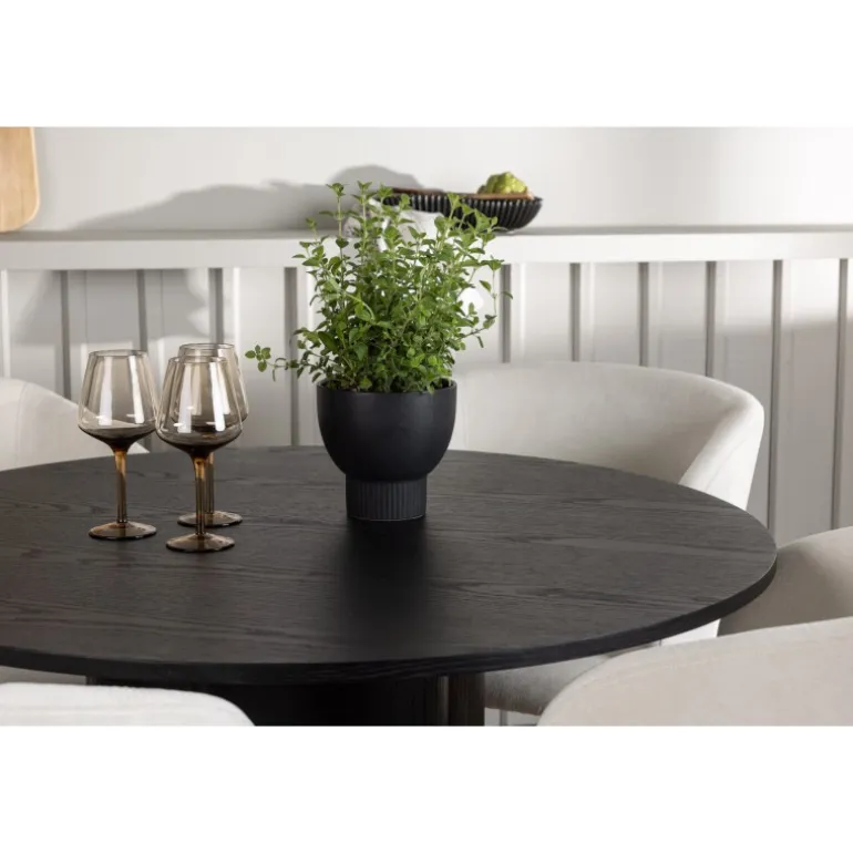 Velkommen hjem til en fascinerende fremvisning af stil og elegance med dette runde Spisebordssæt. Dette moderne spisebord og de medfølgende stole fra Day-serien vil forvandle dit hjem til en moderne oase! Vores runde spisebord Olivia præsenterer et skandinavisk design, der straks fanger øjet. Den røgede sorte farve og holdbare MDF-materiale giver dig et tidløst bord. Med sin slanke, runde bordplade og tre stilfulde cylinderformede ben samlet i midten, tilbyder Olivia dig et harmonisk samlet design, der vil imponere både gæster og familiemedlemmer. Bordets diameter: 110 cm. Her, perfekt matchet, er vores vidunderlige hvide stole fra Day-serien. Med gennemtænkt design og bløde kurver tiltrækker disse stole straks opmærksomhed. Det hvide linnedstof på sædet giver en luksuriøs følelse, mens de slanke sorte stålben tilføjer et moderne og minimalistisk touch. Sæt tonen i dit hjem med dette moderne Spisebordssæt og skab en atmosfære, der får dig til at føle dig lige hjemme. Det skal føles hyggeligt at komme hjem!