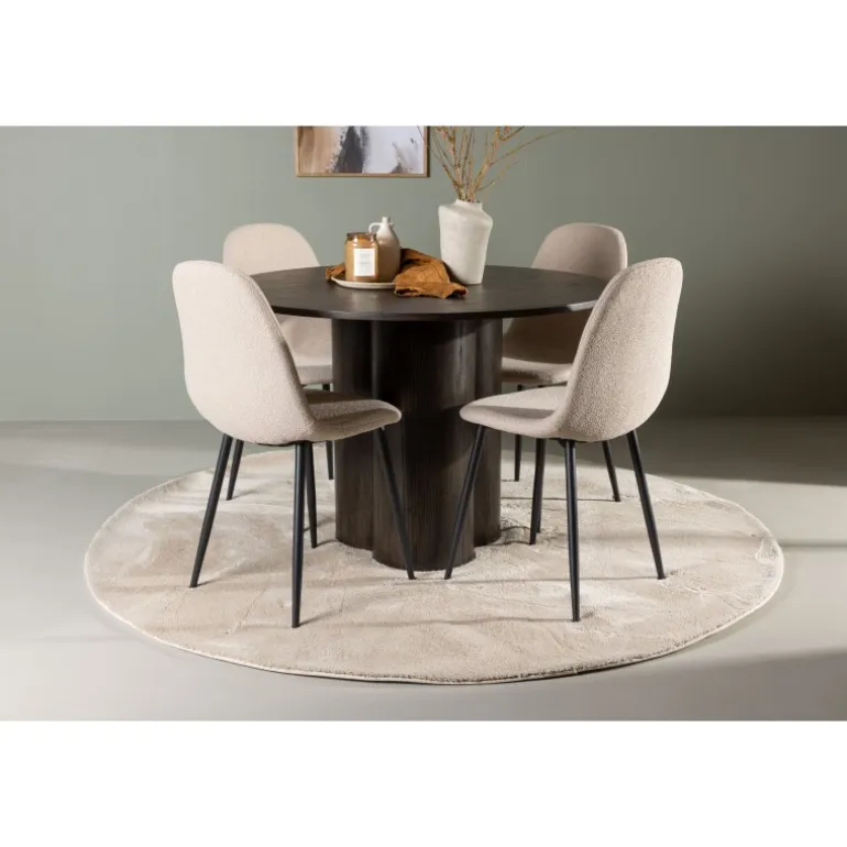 Et varmt og charmerende Spisebordssæt i skandinavisk stil, der er designet i overensstemmelse med de nyeste trends! Vores runde spisebord Olivia har en jordnær mørkebrun farve, der tilføjer en hyggelig touch til stuen. Det er lavet af høj-kvalitets MDF-materiale og har en tynd, afrundet bordplade og tre cylinderformede ben, samlet i midten af bordet. Bordets dimensioner: 110 cm. Sammen med vores beige spisestole fra Polar-serien, er Spisebordssættet komplet. Disse stole har et fuldt polstret design med en rummelig, afrundet ryglæn og sæde. Deres beige bouclé-stof med blød polstring indbyder til timers afslapning og hyggelige øjeblikke ved spisebordet. Benene er lavet af sort pulverlakeret metal, hvilket giver en elegant kontrast til bordets mørke nuance. Her behøver du ikke gå på kompromis mellem stil og komfort. Dette Spisebordssæt står tidens prøve, samtidig med at det matcher moderne former. Sæt dig ned, sid behageligt, og nyd latter og samtaler omkring et hyggeligt Spisebordssæt!