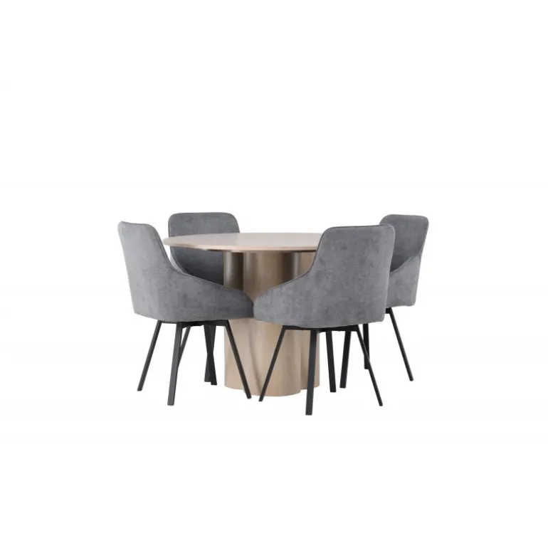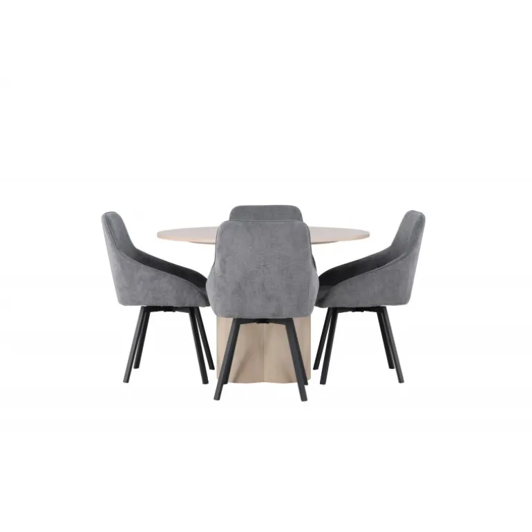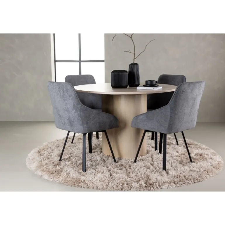 Skab en tidløs stemning i dit hjem med dette indbydende Spisebordssæt – en kombination af skandinavisk elegance og opmærksomhed på detaljer! Vores hvidvaskede spisebord Olivia, med sit ensartede design i hvidvasket MDF, tilbyder en slank og rund bordplade, der straks fanger øjet. Med tre cylindriske ben, der elegant samles under midten af bordet, giver Olivia en balanceret og moderne æstetik til dit opholdsrum. Bordets diameter er 110 cm. For at komplementere dette moderne spisebord er vores grå spisebordsstole fra Rosie-serien kombineret for at skabe en perfekt harmoni. Rosie imponerer med sit fuldt polstrede sæde i gråt stof og integrerede armlæn. Stolens skrå sorte metalben tilføjer et tidløst præg og forstærker det skandinaviske udtryk. Når du sidder i de bløde sæder i Rosie-stolene, vil du straks føle dig omfavnet af komfort og inviteret til lange og hyggelige spisestunder. Dette Spisebordssæt kombinerer ikke kun stil og kvalitet, men giver også den perfekte ramme for at løfte din indretning til næste niveau!