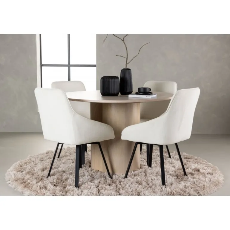 Skab en atmosfære af tidløs elegance og skandinavisk charme med dette indbydende Spisebordssæt! Vores runde spisebord fra Olivia-serien imponerer med sit slanke design og smagfulde detaljer. Med et samlet design i hvidvasket MDF og en tynd, rund bordplade, udstråler dette bord en følelse af lethed. De tre cylinderformede ben giver stabilitet og er pænt samlet under midten af bordet. Bordmål: 110 cm. Her er bordet kombineret med vores komfortable spisebordsstole fra Rosie-serien. Disse stole blander perfekt stil og komfort. Med deres skandinaviske design har de fuldt polstrede sæder med integrerede armlæn i blødt beige stof. De let udadbuede stoleben i sort metal tilføjer et moderne touch. Sædet er også polstret for ekstra komfort, så du kan nyde lange middage uden problemer. Med Olivia og Rosie Spisebordssættet kan du skabe en indbydende og harmonisk atmosfære i din stue eller køkken. Uanset om du vil nyde en hyggelig middag for to eller invitere venner og familie til fest, vil disse møbler give dig den perfekte kombination af stil, funktionalitet og komfort!
