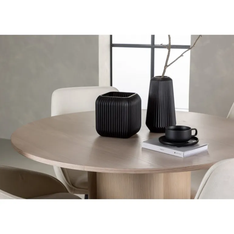 - Elegant skandinavisk design: Hvidvasket MDF bordplade og cylinderformede ben.