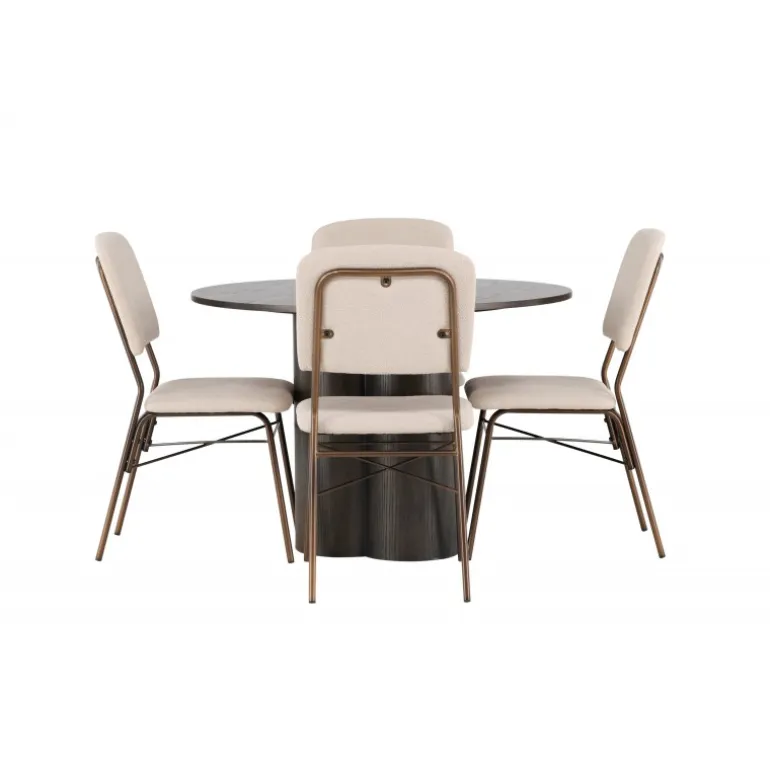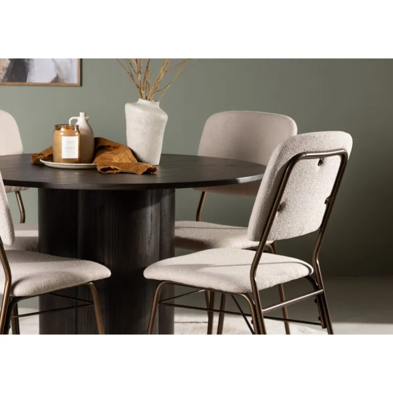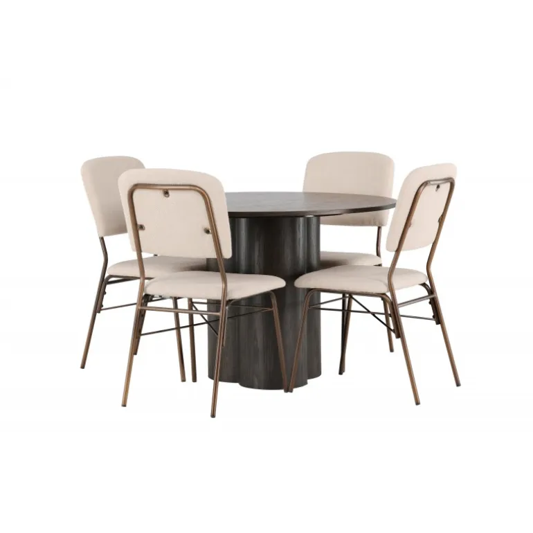 Skandinavisk elegance og fantastisk komfort – dette Spisebordssæt imponerer med sine jordnære toner og rene look! Vores mørkebrune spisebord Olivia er lavet af højkvalitets MDF-materiale og har en tynd, rund bordplade, der tilføjer et moderne touch. De tre cylinderformede ben, perfekt positioneret under midten af bordet, giver en stabil og robust konstruktion, der vil holde i mange år. Bordets dimensioner: 110cm. Sammen med det runde spisebord Olivia følger vores spisestole i skandinavisk stil fra Seda-serien. Stolen er polstret med blødt og tekstureret polyesterstof i en smuk beige nuance. Det mørkebrune stål, der udgør stolens ben, skaber en harmonisk kontrast til stoffets farve. Hvad mere kan man ønske sig? Med sin jordnære farvekombination er dette Spisebordssæt både elegant og let at matche med resten af dit interiør. Nyd aftener fyldt med latter, god mad og behageligt selskab!