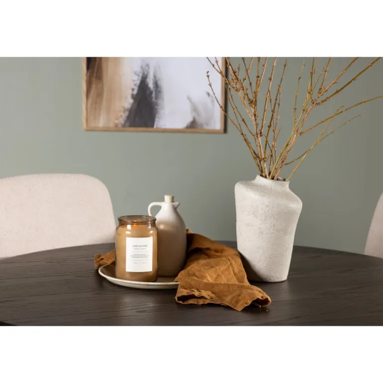 - Jordnære toner: Mørkebrunt bord og beige stole skaber en harmonisk og elegant atmosfære.