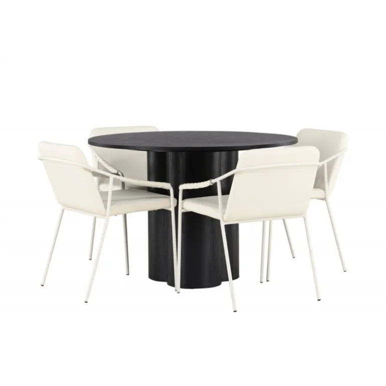 Ingen grund til at gå på kompromis mellem stil og komfort – dette skandinaviske Spisebordssæt vil garanteret imponere i dit moderne hjem! Det runde spisebord Olivia er en sand repræsentant for skandinavisk design og smagfuld æstetik. I en elegant sort farve, lavet af bæredygtigt MDF-materiale, har bordet en tynd og rund bordplade, der inviterer dig til at sætte dig ned og nyde gode måltider og samtaler med dine kære. De tre cylinderformede ben giver ikke kun stabilitet, men tilføjer også et moderne touch, der fuldender bordets overordnede design. Bordets dimensioner: 110 cm. Sammen med Olivia-bordet får du de smukke stole fra Tvist-serien. Det beige-farvede sæde og ryg i polyuretanlæder og polyester giver en hyggelig følelse, mens de minimalistiske jernben tilbyder god stabilitet. Med disse stole får du ikke kun et behageligt sted at sidde, men også et stilfuldt og moderne design, der vil imponere dine gæster. Skab en atmosfære af varme og elegance i din stue med Olivia og Tvist Spisebordssættet. Det udstråler virkelig luksus og komfort, hvilket måske er lige det, du har brug for for at tilføje et strejf af luksus til din hverdag!