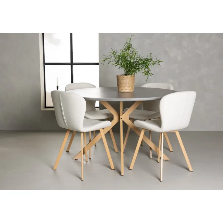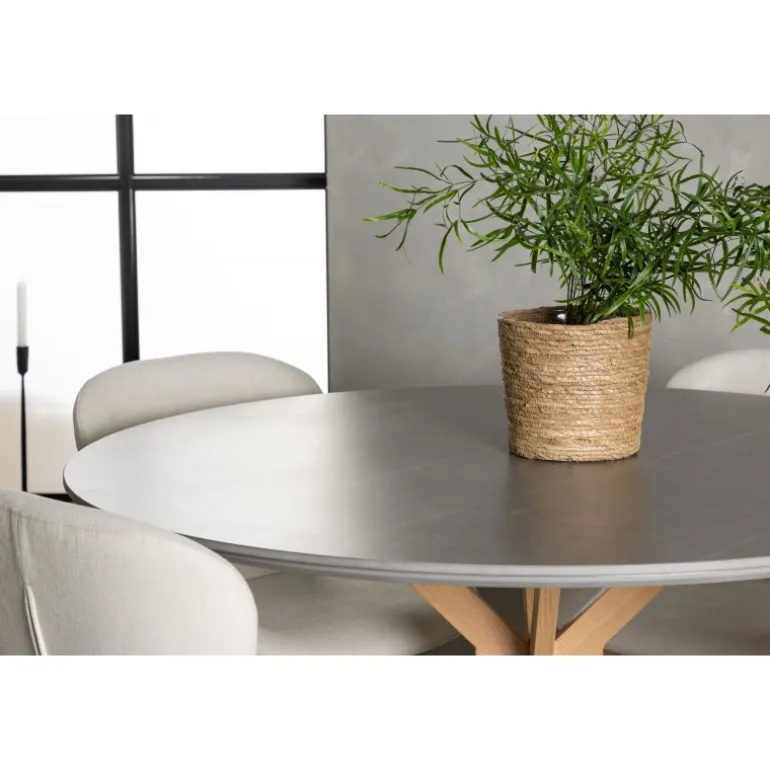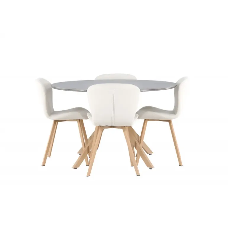 Skab en luksuriøs atmosfære i dit hjem, der føles både moderne og tidløs! Med det elskede runde spisebord fra Piazza-serien vil du opleve en følelse af ren eksklusivitet i dit hjem. Bordpladen er lavet i en smuk grå nuance i spraystone, som tilføjer en elegant touch til din indretning. Den robuste trækrydsfod giver ikke kun en stabil base, men tilføjer også en dekorativ detalje, der fanger øjet. Bordet måler 120 cm. Men det er ikke kun bordet, der imponerer – vores beige spisebordsstole fra Lilja-serien løfter din indretning til et helt nyt niveau. Disse drømmestole i lyse farver skaber en stilfuld og frisk atmosfære i din spisestue. Med fuldt polstrede sæder i beige polyesterstof skaber de en komfortabel og indbydende følelse. De flade og let udadbuede ben i egetræ matcher også spisebordet perfekt. Nyd dejlige måltider og selskab med familie og venner omkring dette elegante bord. Dette Spisebordssæt er den perfekte kombination af stil, komfort og trendy design!