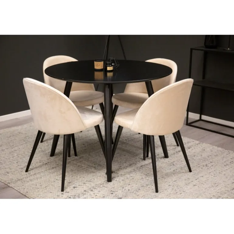 Spisebord Plaza sammen med beige spisestole i serien Velvet – praktisk, hyggeligt og indbydende! Skab noget pænt og socialt med plads til god mad og samvær. Spisebord i sort MDF og spisestole i blød polyester fløjl giver en elegant og komfortabel spiseoplevelse. Bemærk, at malede eller lakerede MDF-overflader er følsomme over for ridser og skader, så vær forsigtig med overfladen.