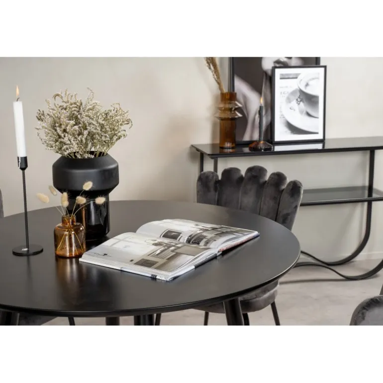 Spisebordet Plaza i et slankt design, kombineret med spisestuestolene Limhamn, er den perfekte kombination for dem, der ønsker en trendy rund Spisebordssæt. De høje siddekomfort på stolene indbyder til lange og vidunderlige stunder med socialt samvær! Spisebordet har en sort MDF-bordplade, der tilføjer et moderne touch til dit hjem. Husk, at MDF-bordplader er følsomme over for ridser og skader, så vær forsigtig med overfladen. Plejer råd: Brug en blød, tør klud til daglig vedligeholdelse, og tør straks enhver spildt væske af.