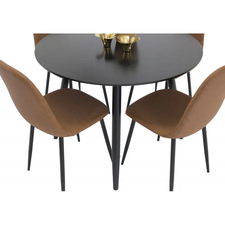 Klassisk Spisebordssæt, der passer ind i de fleste husholdninger! Spisebordet Plaza sammen med de brune stole i Polar-serien er perfekt til dem, der ønsker at skabe en hyggelig og moderne atmosfære i hjemmet. MDF-bordpladen er sort og giver et stilrent udtryk, mens de brune stole i PU tilføjer varme og komfort.