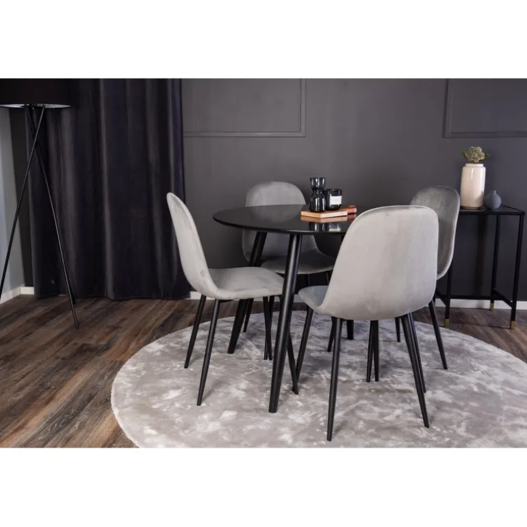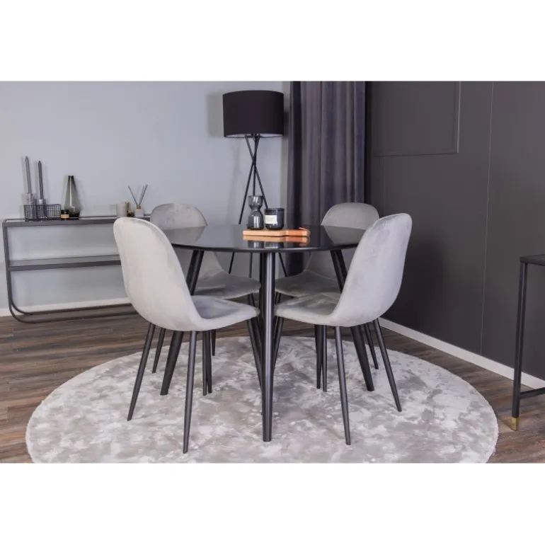 Oplev den perfekte balance mellem rustik charme og moderne elegance med Spisebordssættet Plaza og stolene fra Polar serien. Dette kompakte Spisebordssæt i neutrale farver passer ind i de fleste hjem og skaber en hyggelig atmosfære. Det sorte MDF-bord og de komfortable stole i polyester velour gør det ideelt til enhver spisestue.