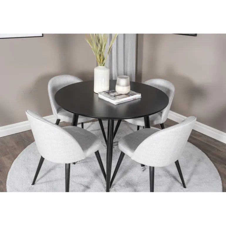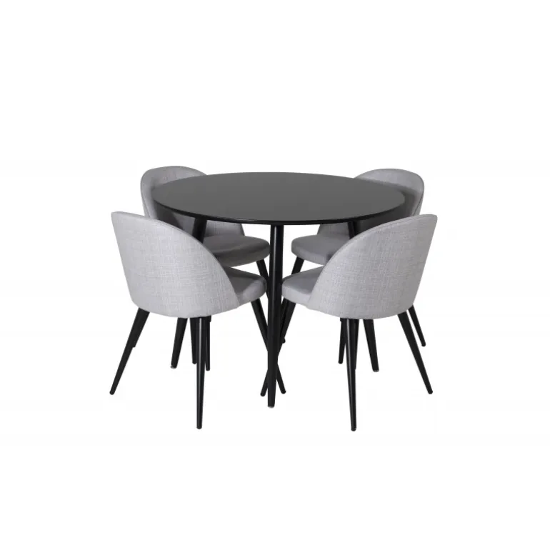 At købe et færdigkomponeret Spisebordssæt er både trend-sikkert og praktisk! Her kombinerer vi vores spisebord Plaza med vores siddevenlige spisebordsstole Velvet. Lad hjemmets hjerte præges af dit nye iøjnefaldende Spisebordssæt. Spisebordet er lavet af sort MDF, og det kræver en vis omhu for at undgå ridser og skader. Stolene er betrukket med grå polyester, som også kræver særlig pleje for at undgå falmning og pletter. Dette sæt er ideelt til dig, der ønsker både stil og funktionalitet i spisestuen.
