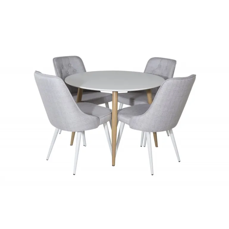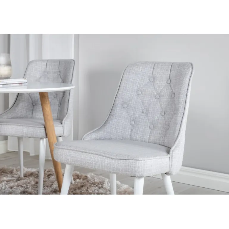 - Materialer af høj kvalitet: Hvid MDF-bordplade og lys grå Velvet Deluxe stole i polyester.