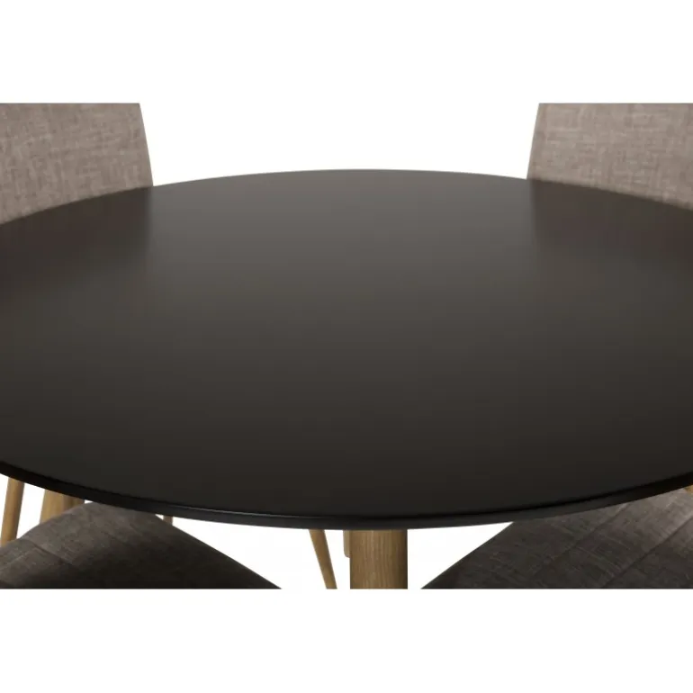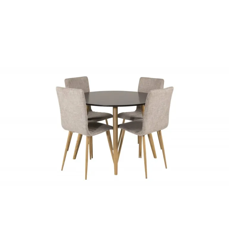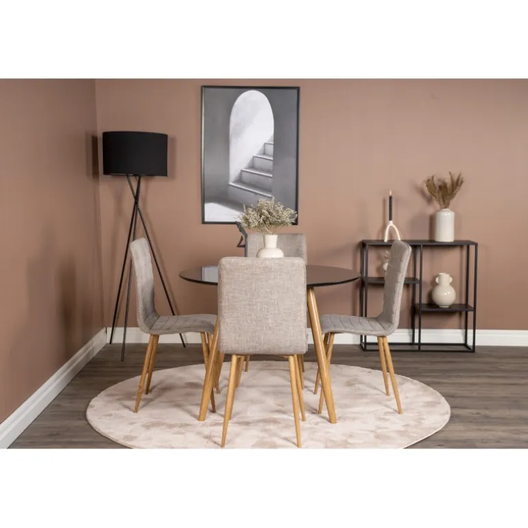 Klassisk Spisebordssæt, der passer til de fleste hjem! En flot kombination af spisebord fra Palace-serien og spisebordsstole fra Windu-serien. Spisebordets bordplade er i sort MDF, hvilket giver et stilfuldt og moderne udtryk. Stolene er i lys grå polyester linned, som tilføjer et naturligt og indbydende look til dit spiseområde. Vær opmærksom på, at bordet kræver samling.