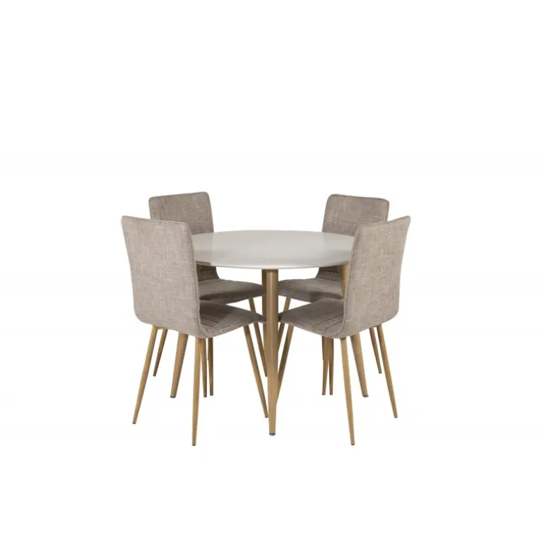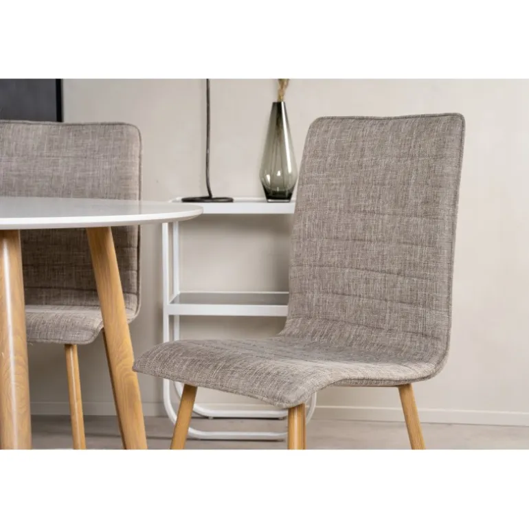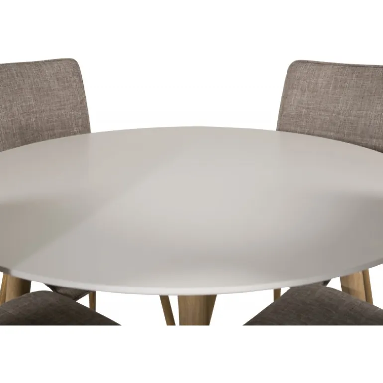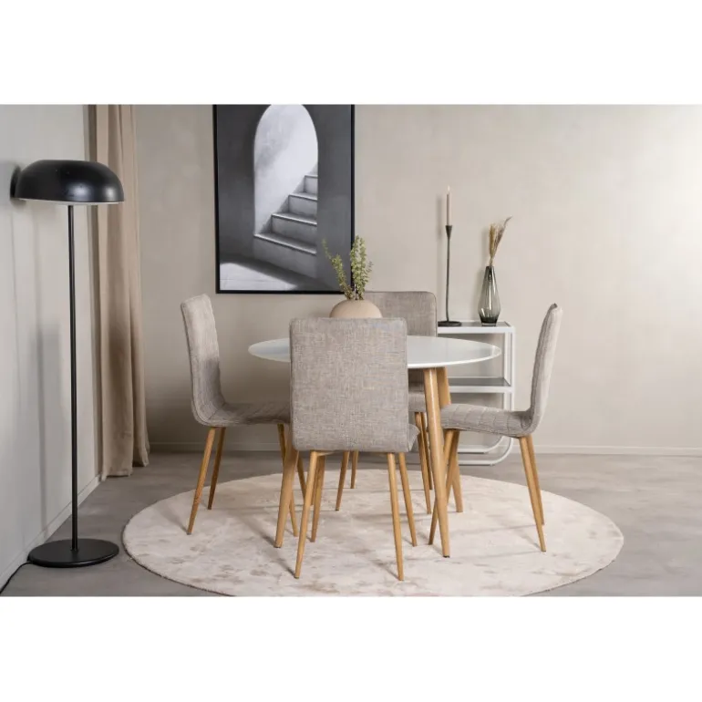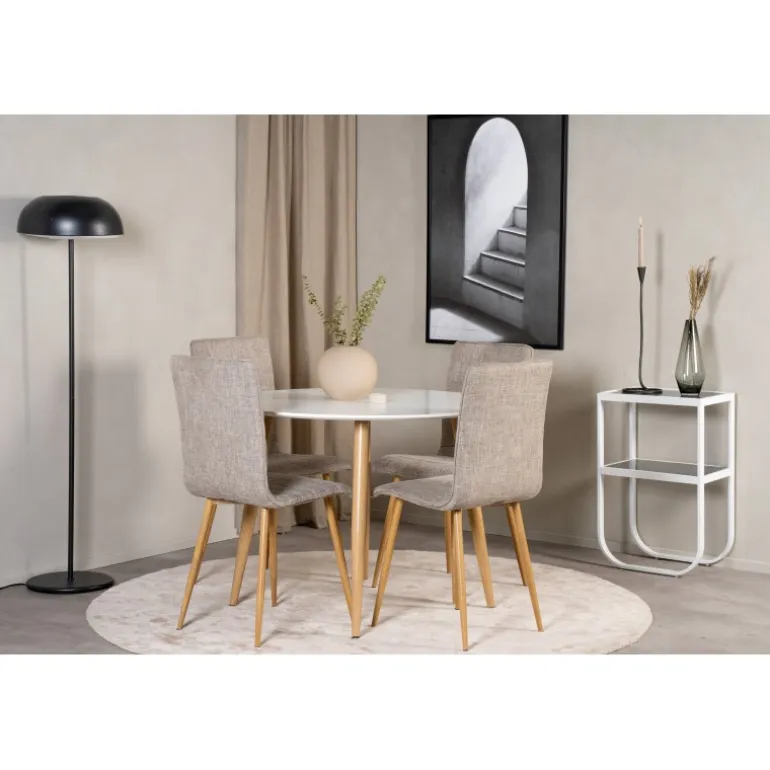 Klassisk Spisebordssæt, der passer ind i de fleste hjem! En flot kombination af spisebord fra Palace-serien og spiseborde fra Windu-serien. Hvid MDF-bordplade med naturfarvede detaljer og lysegrå stole med komfortable sæder. Dette elegante sæt er ideelt til enhver spisestue og tilbyder både stil og funktionalitet. Perfekt til daglig brug og nem at vedligeholde med korrekt pleje. Husk, at samling er påkrævet.